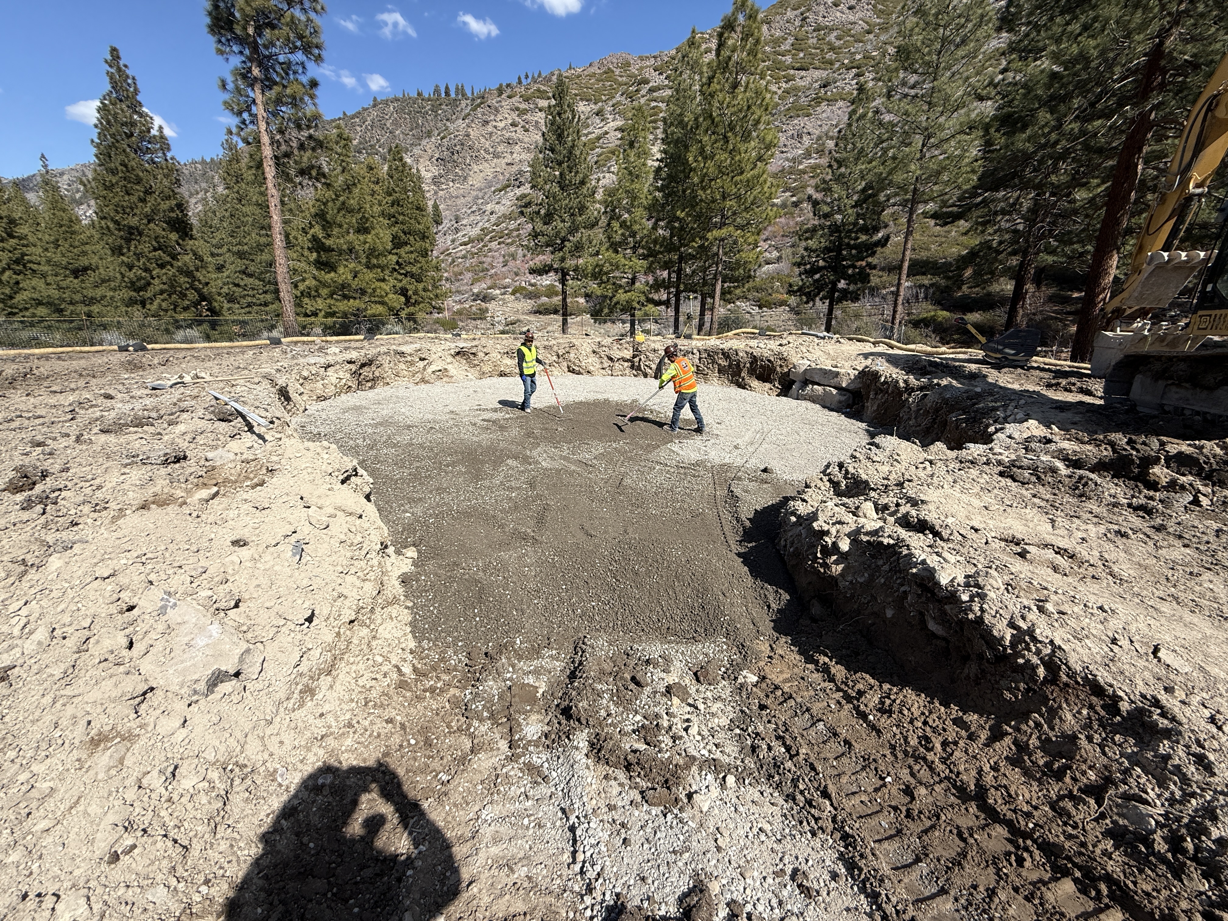 In the image, two workers are spreading gravel on a foundation area using tools. The area appears to be compacted earth with a layer of gravel being leveled. In the background, an excavator is positioned near the workspace. Trees and hills surround the site, indicating a likely remote location.