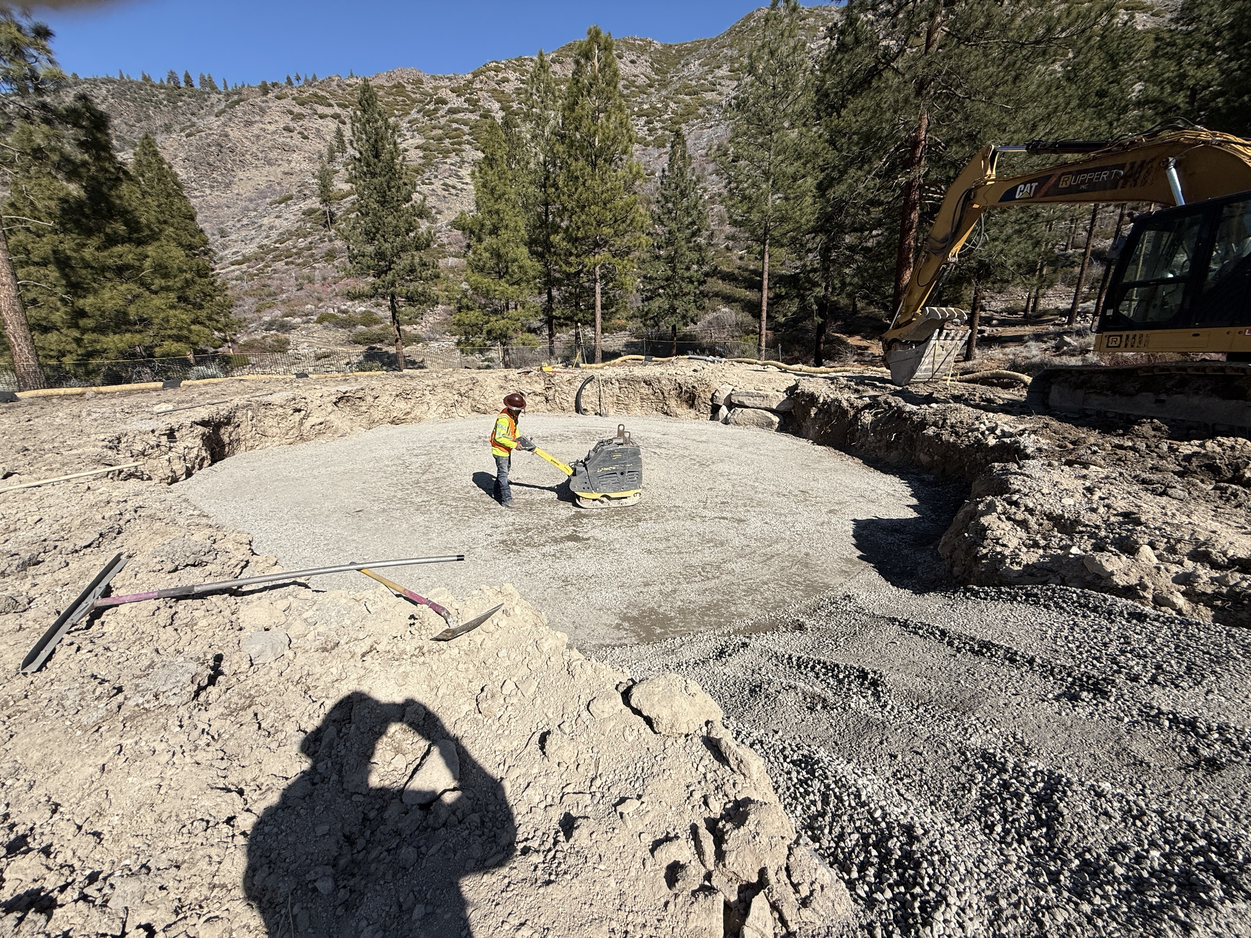 A worker is operating a plate compactor on a gravel surface within a circular excavation. An excavator with a bucket is positioned nearby, suggesting recent or ongoing earth movement. Surrounding the area are dirt mounds, likely from the excavation. The environment is mountainous with several trees in the backdrop.