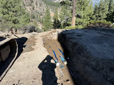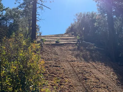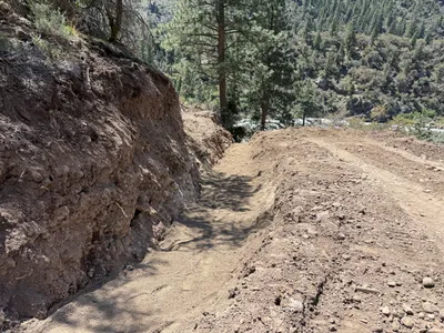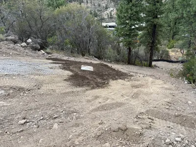 The image shows a cleared and leveled gravel area, which may serve as a foundation or pad. The site is bounded by an earthen edge and surrounded by trees, suggesting a remote or forested location. A shadow indicates the presence of a camera or surveying equipment. No active work or workers are visible in the frame.