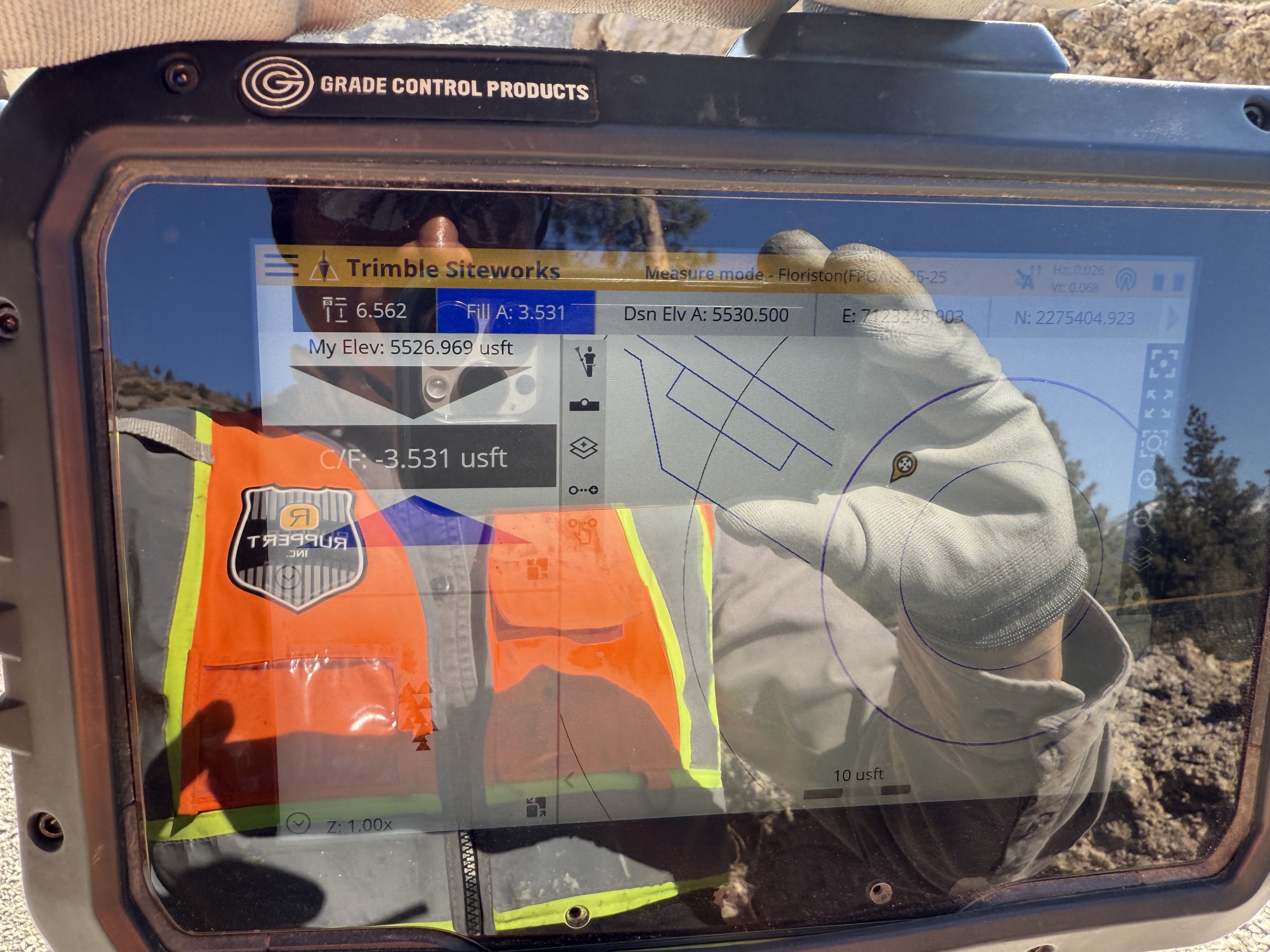 A Trimble Siteworks device is being held by a worker wearing PPE on a construction site. The screen reflects elevation data, such as 'My Elev: 5526.969 usft', and other site measurement details, with part of the worker's vest and environment visible. The location appears to be an outdoor hilly area.