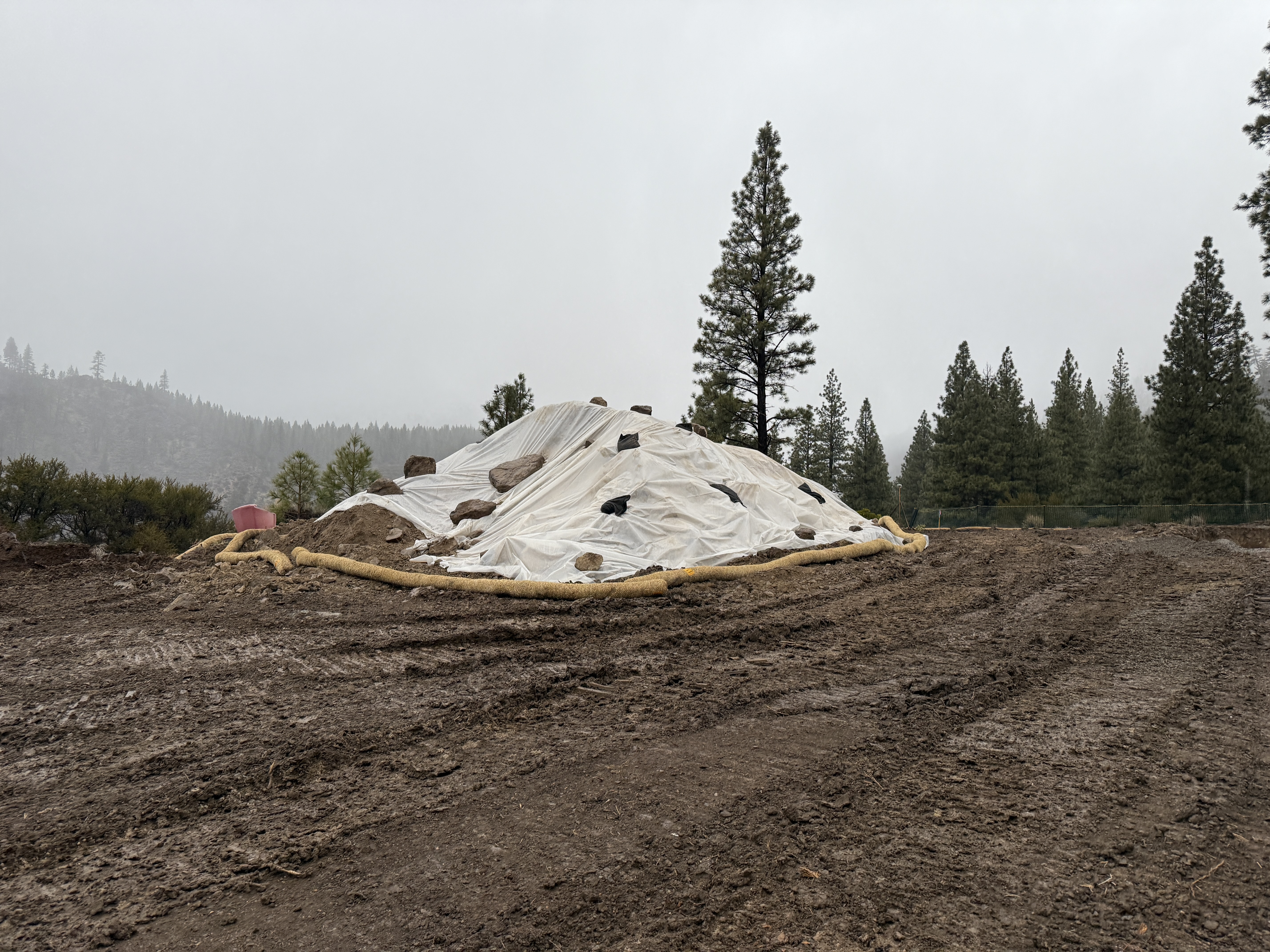 The image shows a large pile of soil covered with a white tarp held down by rocks. There is a yellow erosion control device, likely a silt sock or similar, placed around the perimeter of the mound. The background includes trees and a misty sky. The activity appears related to erosion control and protection of materials or soil on site.