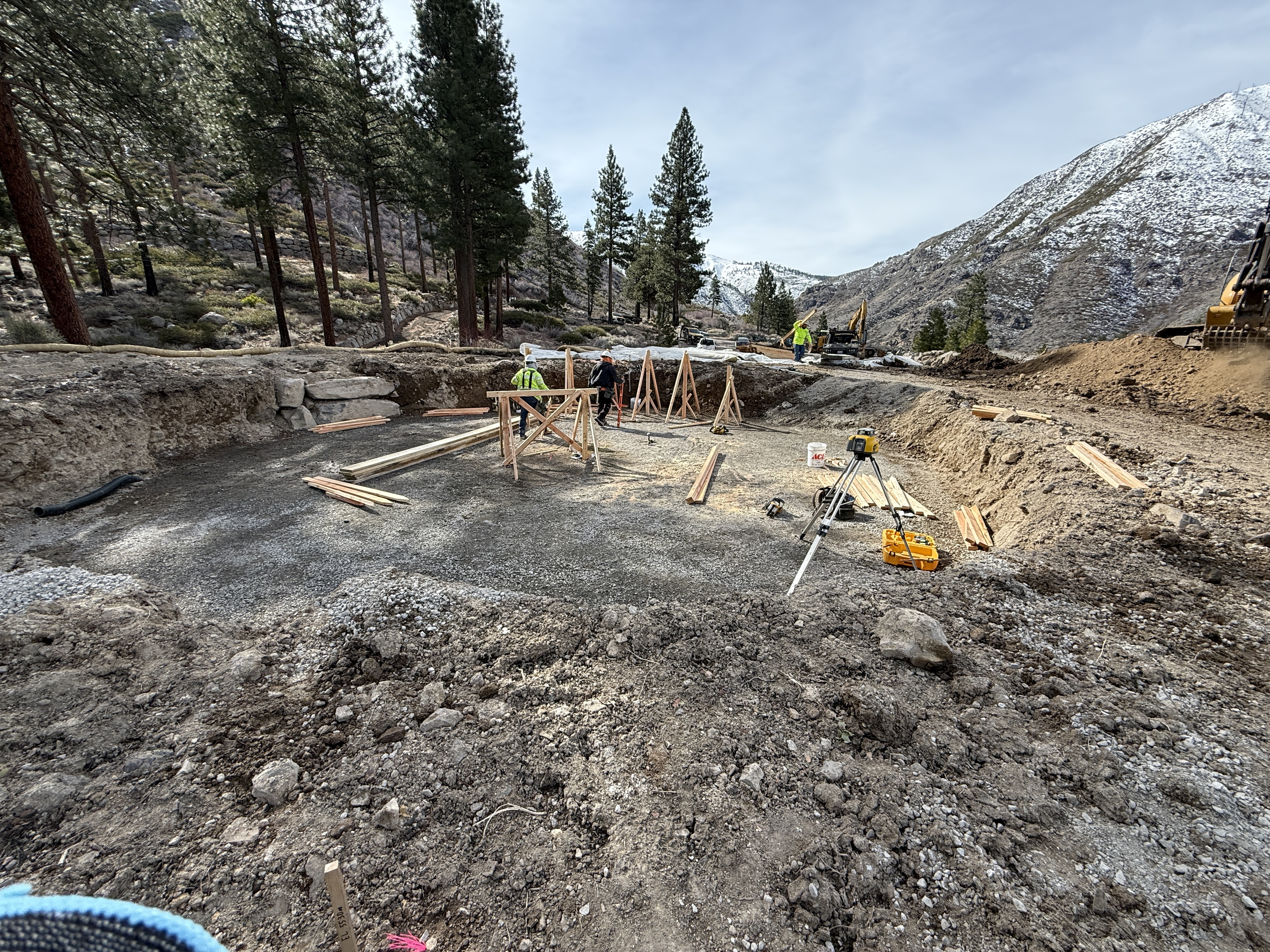 Several workers are present at a construction site in a mountainous region, engaged in survey and layout activities. There are wooden stakes around the perimeter of a leveled gravel area, suggesting layout preparations. A tripod with measurement tools is visible, indicating survey work. Heavy machinery is present in the background, and some workers are wearing PPE.