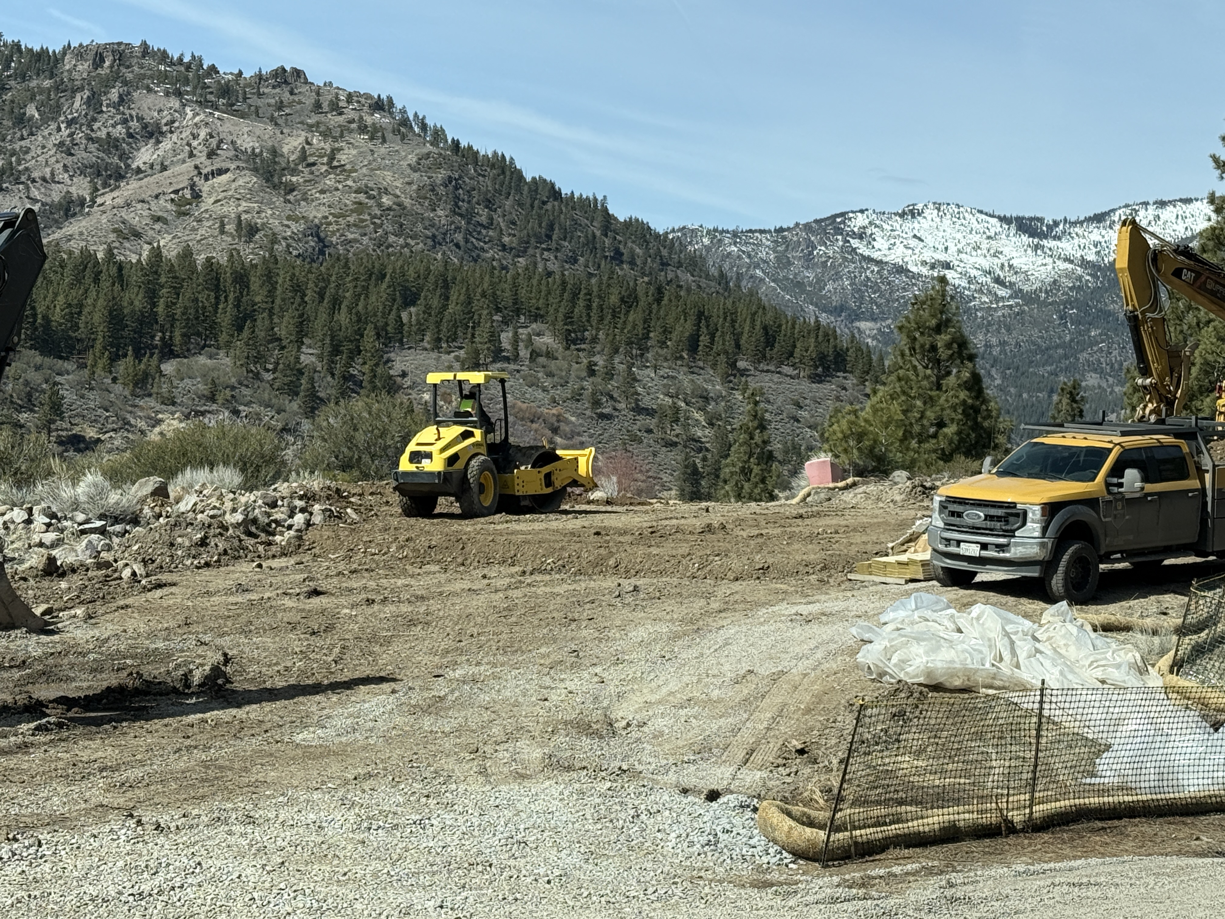 A roller compactor is actively being used on a dirt surface for site grading. The compactor is positioned centrally, while a yellow and gray service truck is parked to the right, next to construction materials covered with white plastic sheeting. The surrounding landscape includes mountainous terrain with a mix of trees and rocks.