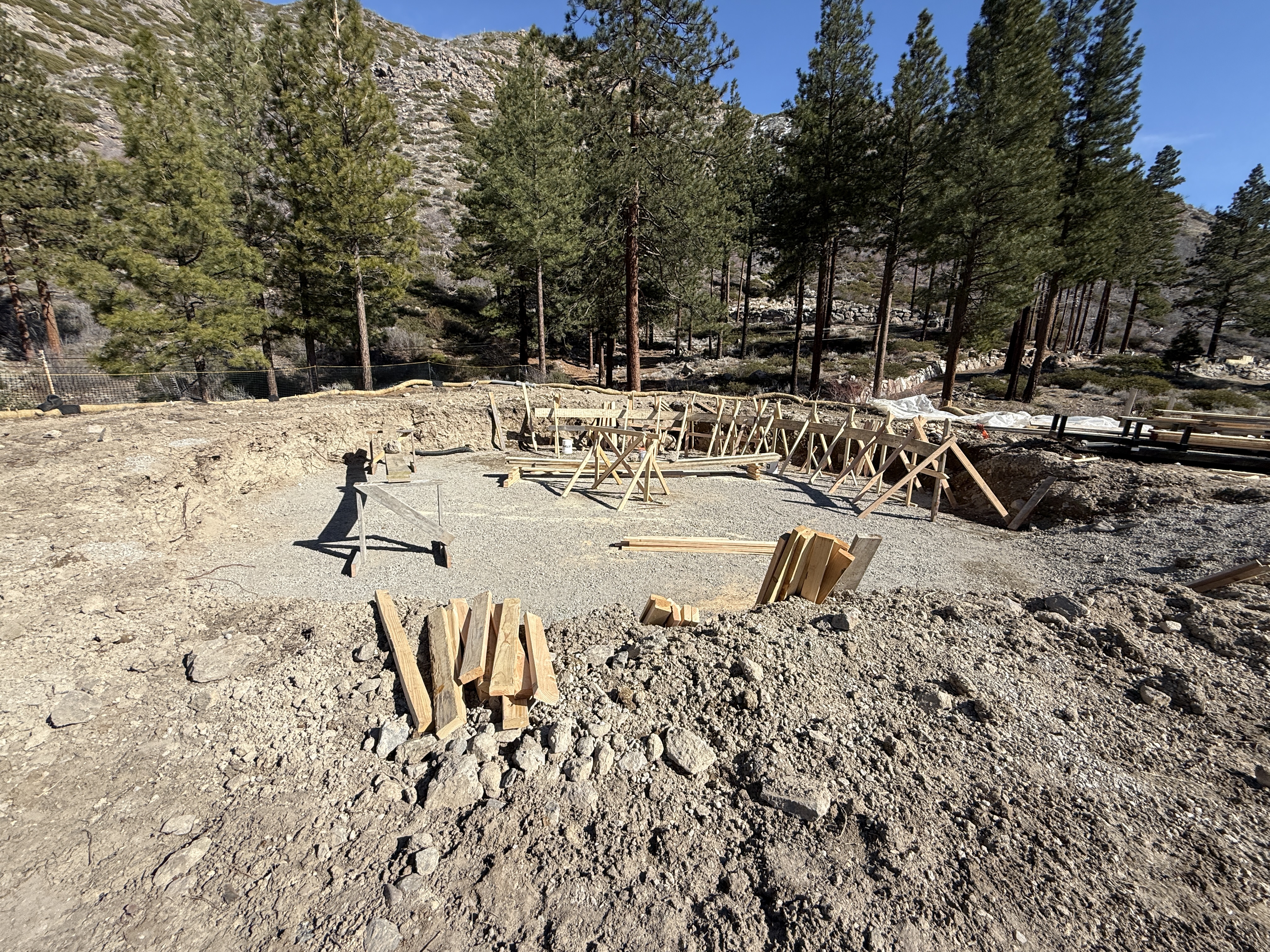 The image shows a foundation area with wooden formwork in the process of being assembled. The base is covered with gravel and is surrounded by cleared soil. Wooden planks and construction supports are scattered around the site, indicating ongoing preparation work for concrete pouring. The background includes trees and an open natural setting, suggesting a remote or scenic location.