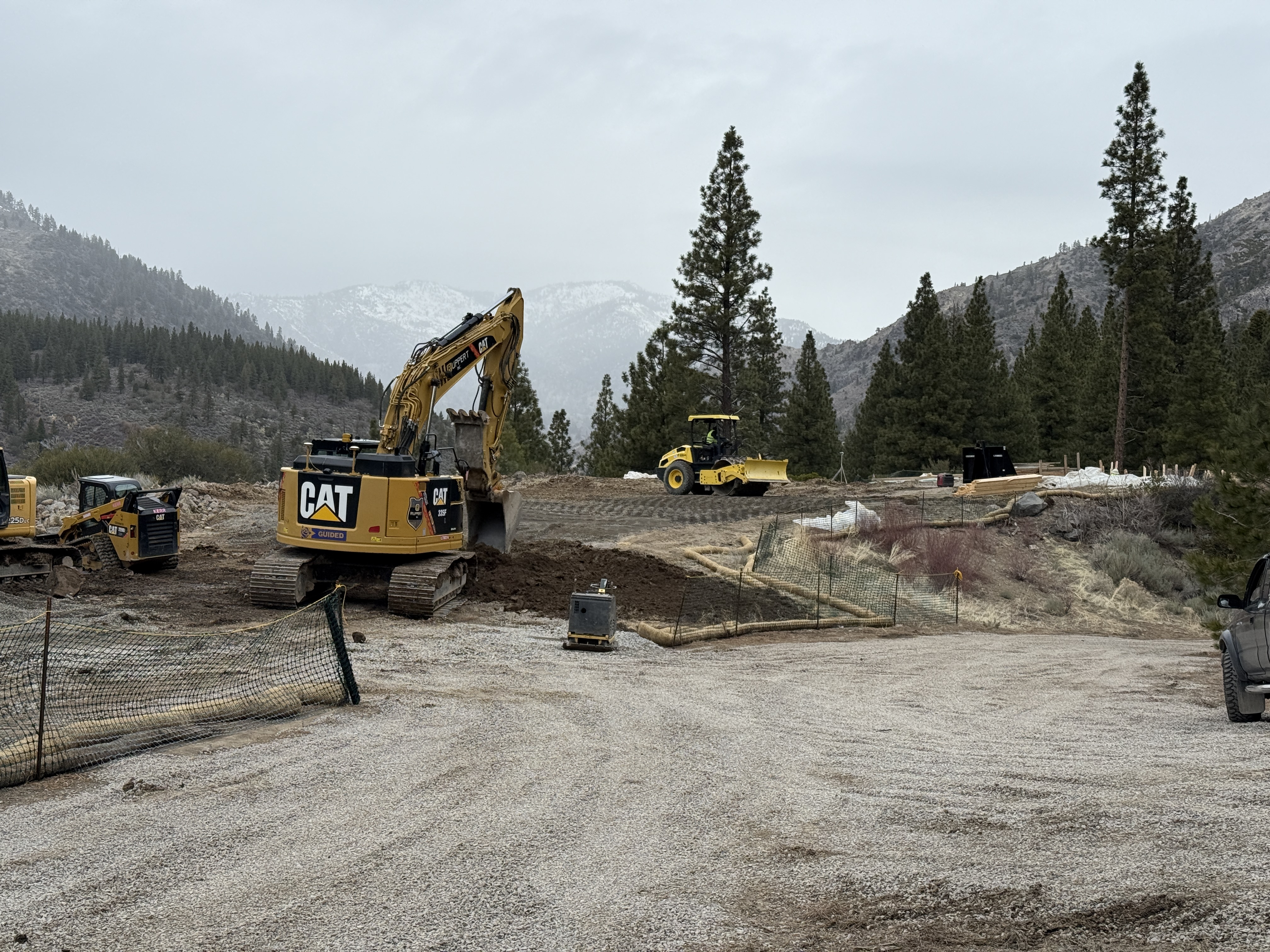 The image shows site-grading activities with a large excavator moving soil in an area surrounded by trees and mountains. There is a bulldozer parked on a graded area. A gravel access road is also visible. The scene suggests initial phases of site preparation work, though specific details about the overall project are unclear.