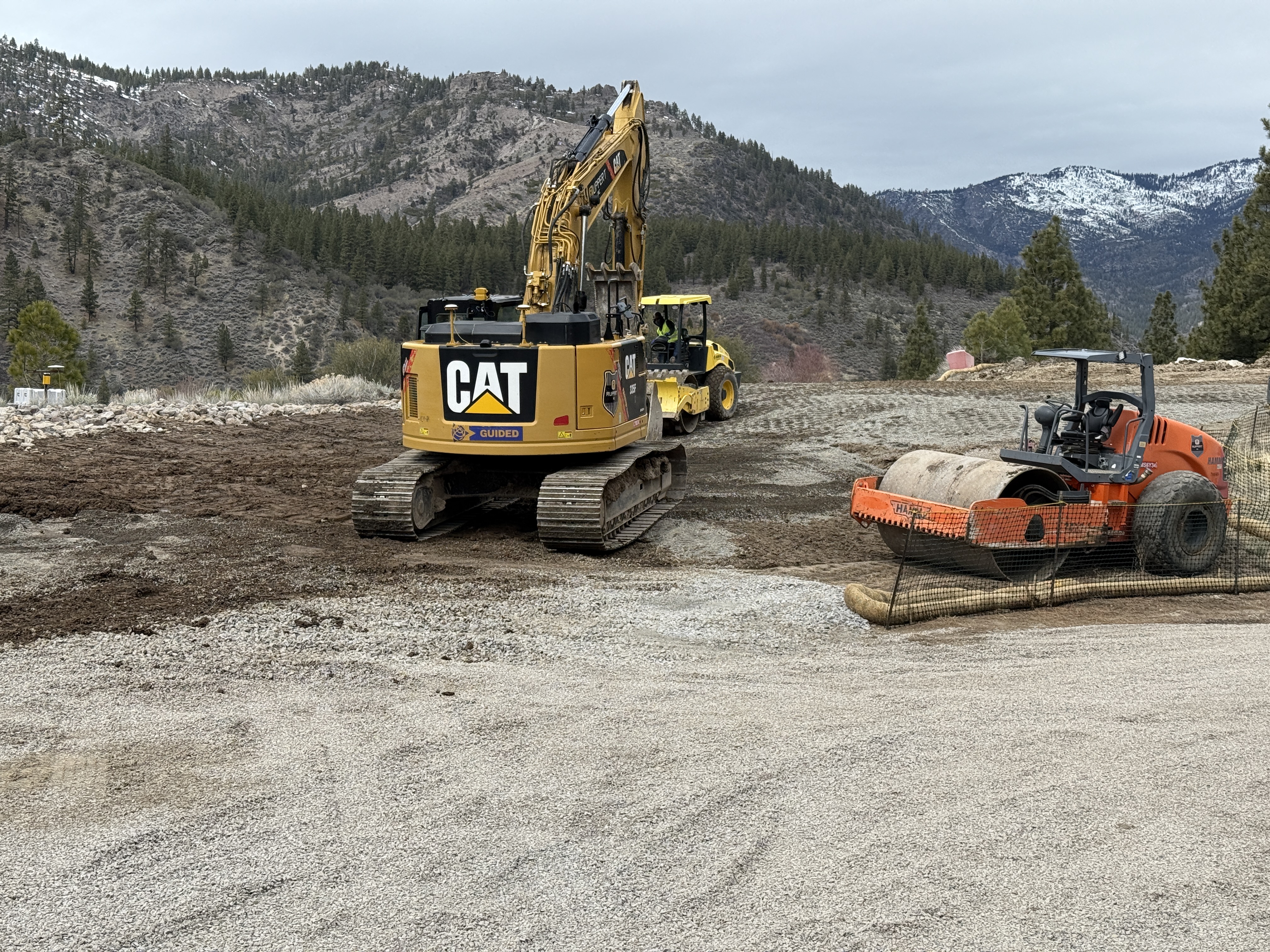 The image shows an active construction site with an excavator and a roller compactor working on land preparation. The excavator is positioned centrally, potentially engaged in leveling or moving soil. The roller compactor is situated to the right, likely compacting soil or gravel. The background features a mountainous landscape, indicating an outdoor setting.