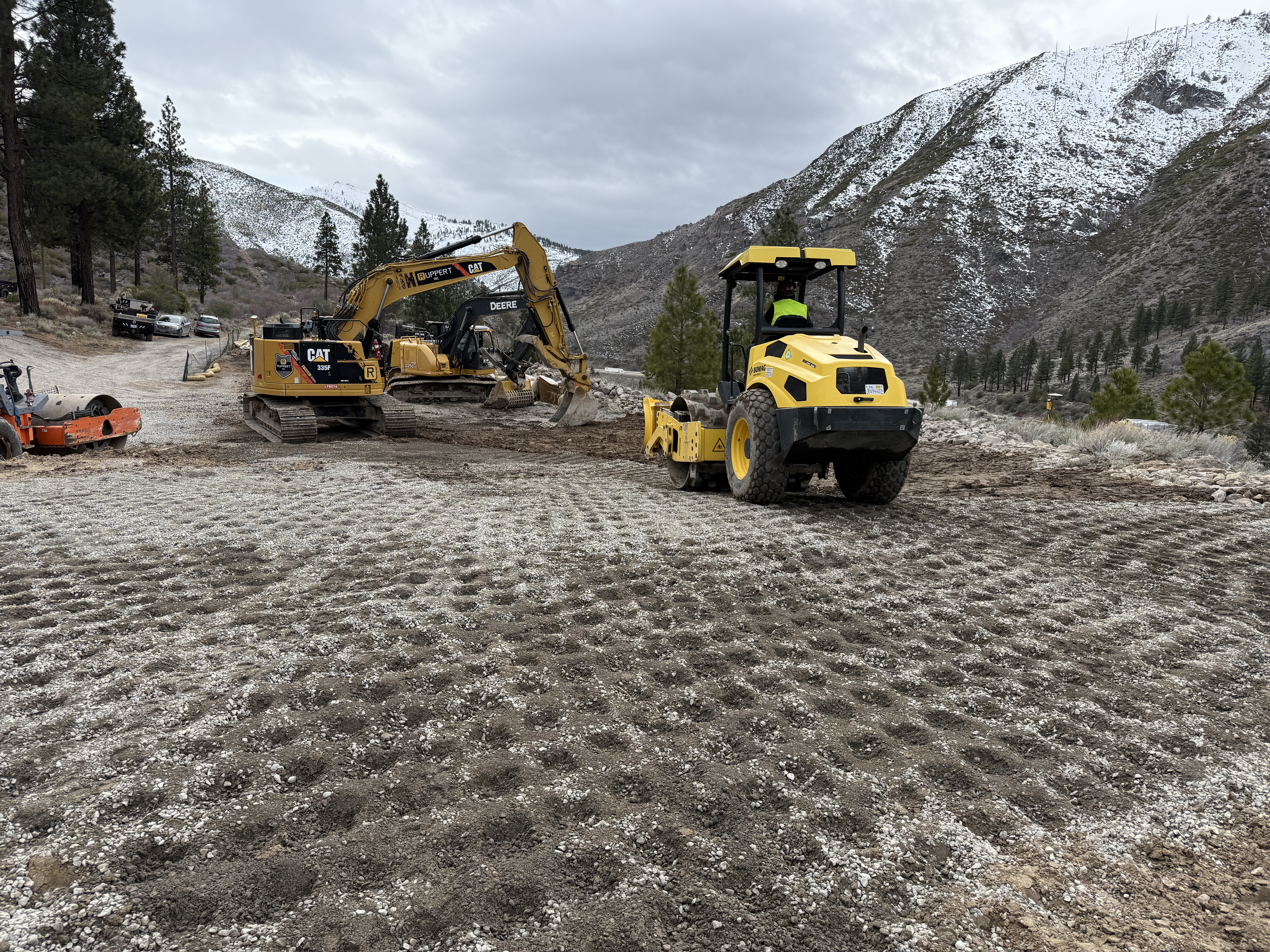 The image shows a site grading operation in progress with visible equipment like an excavator, a compactor, and a backhoe. The area features graded soil with a pattern indicating compaction. The site is located in a mountainous region with visible snow on the surrounding slopes. The weather appears overcast, and the access path is visible on the left side.