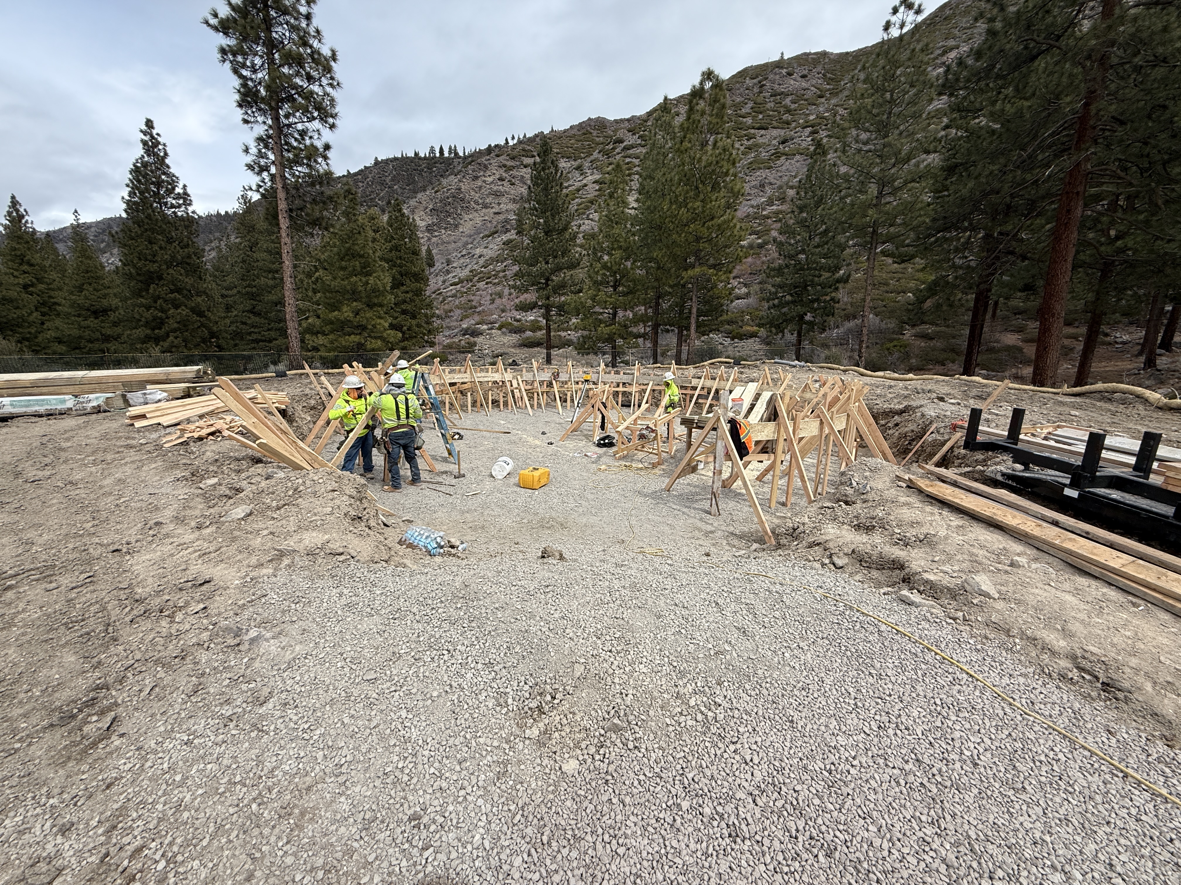 A group of construction workers is setting up wooden formwork for what appears to be a circular tank foundation. The workers are standing inside a roughly circular prepared area surrounded by wooden stakes and boards. Gravel and earth form the immediate surface underfoot. Tall coniferous trees and foothill terrain are visible in the background, suggesting a rural outdoor setting.