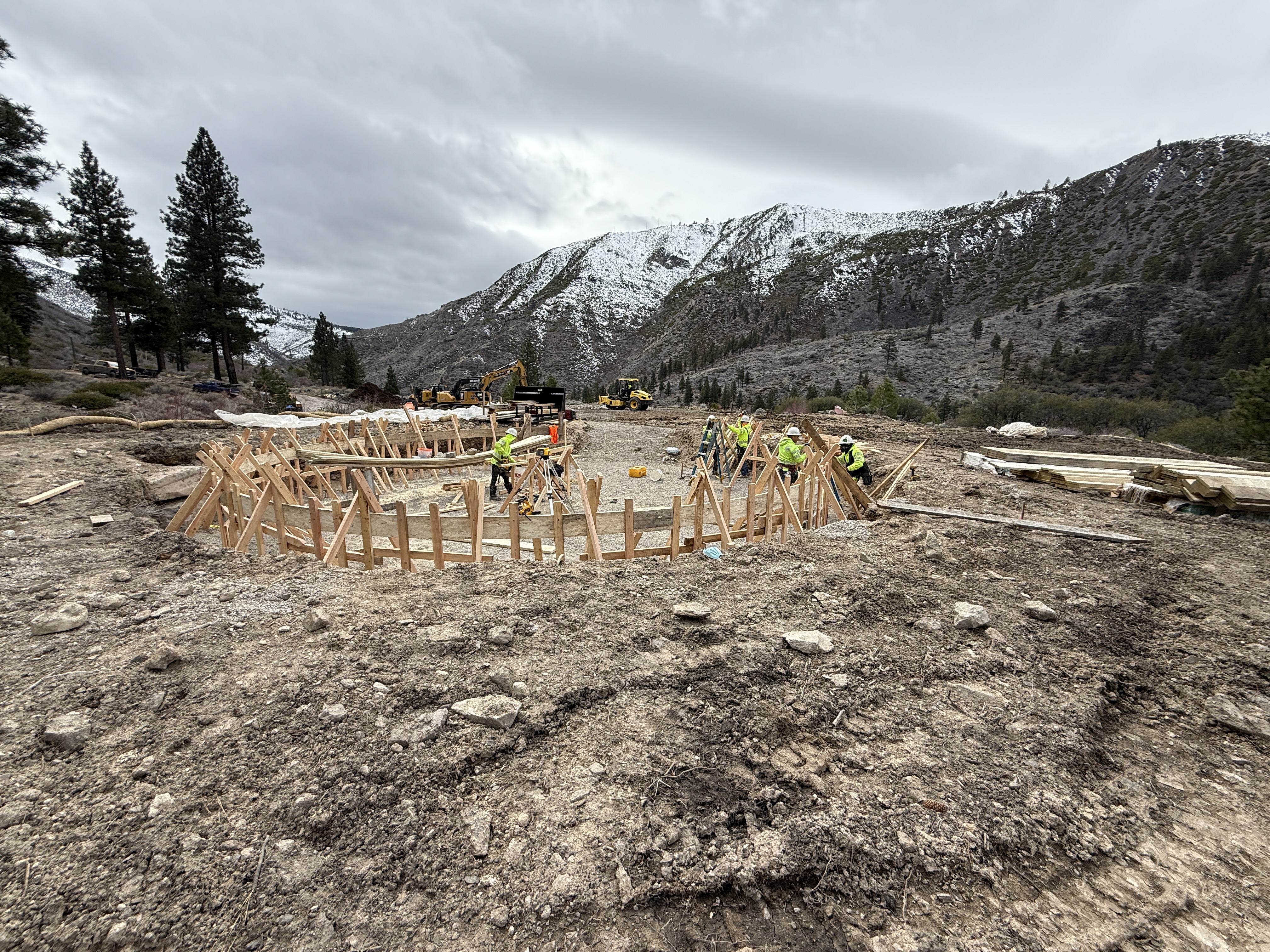 The image shows workers assembling wooden formwork for a tank foundation in a mountainous terrain. Several workers in safety gear are involved in the process. Machinery is seen in the background, suggesting ongoing construction activity. The site is surrounded by a natural landscape with snow-capped mountains in the distance.