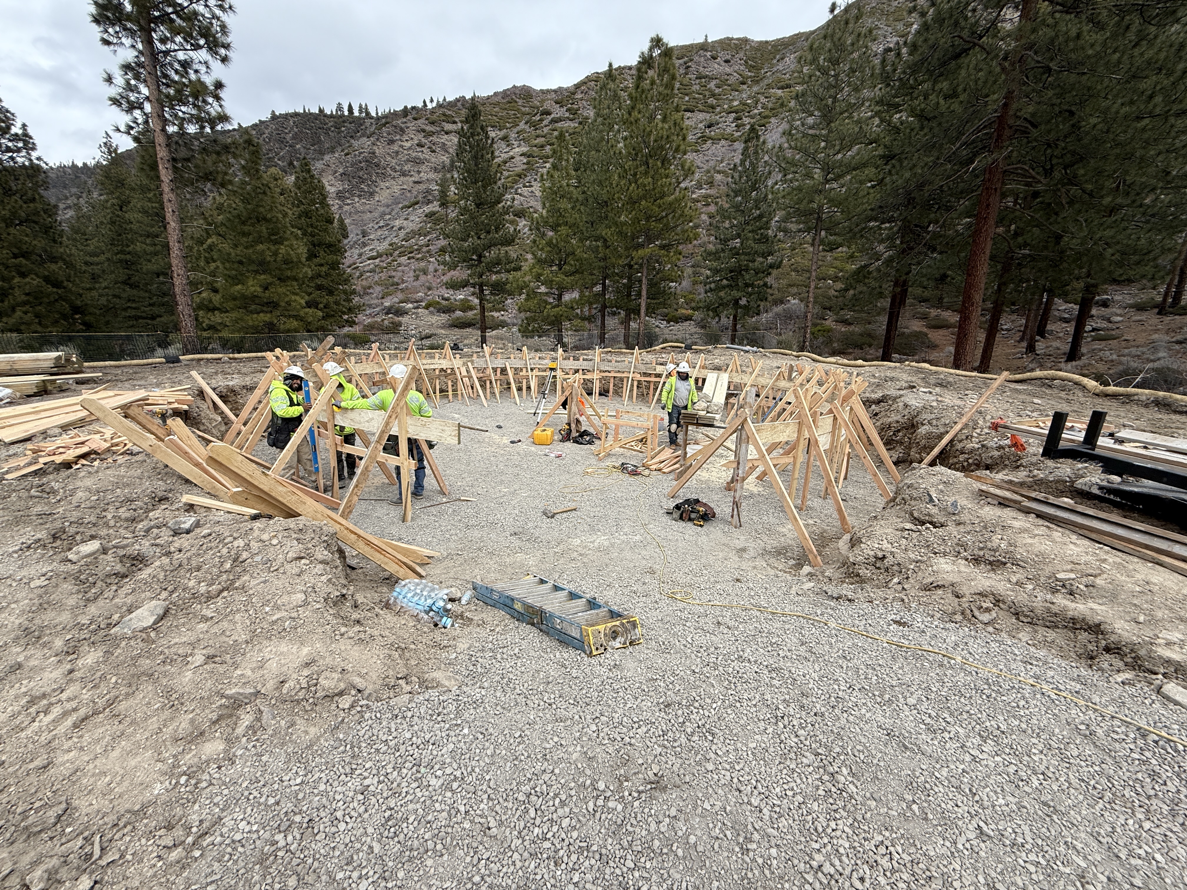The image shows several workers assembling wooden formwork around a circular foundation area. The ground within the area is covered with gravel, and wooded hills and trees surround the site. Workers are using tools and wearing safety gear including hard hats, hi-vis vests, and work boots. The formwork is constructed with wooden braces for support.