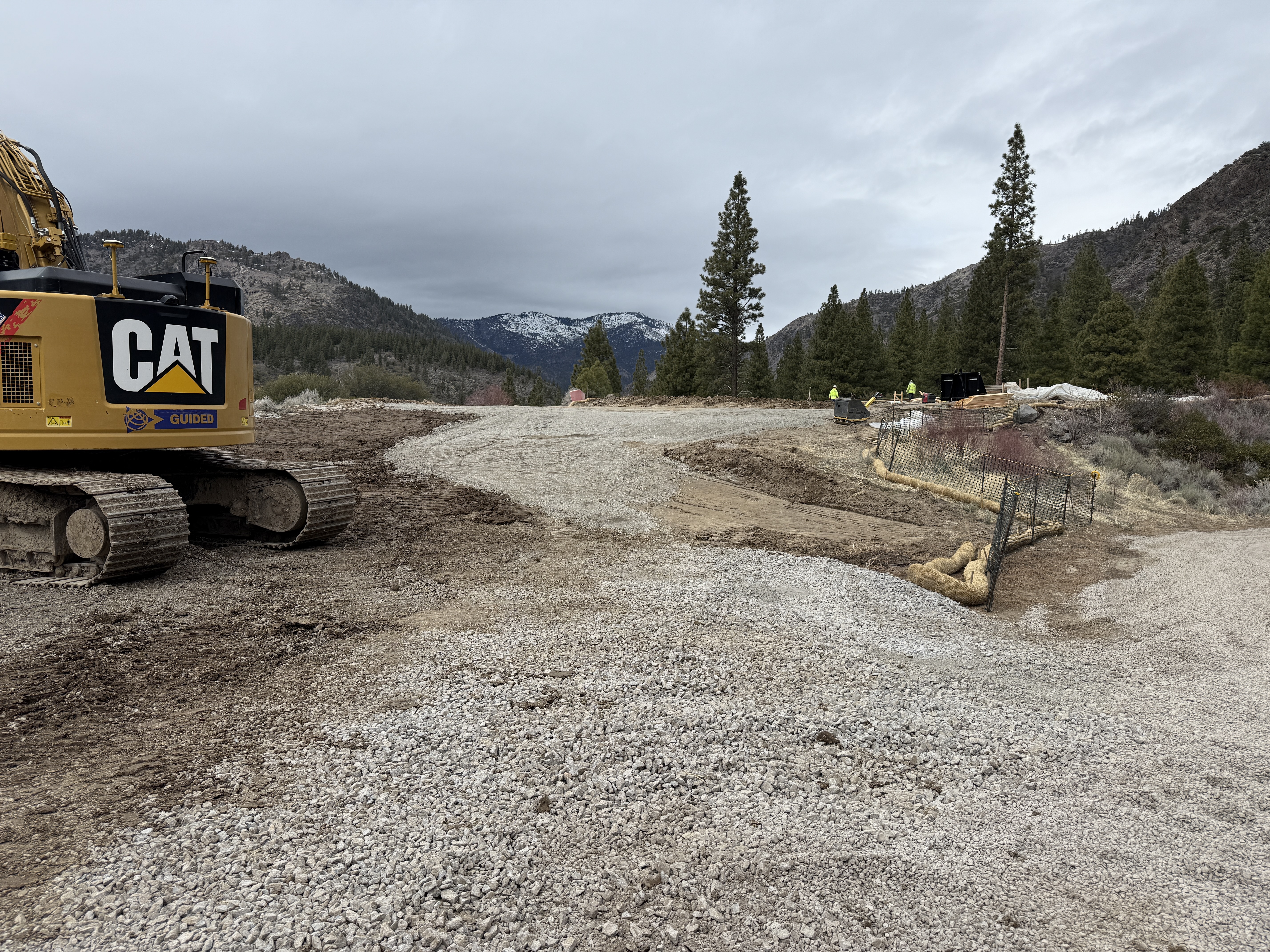 The image shows a site-grading operation with a piece of heavy machinery in the foreground and a prepared gravel area behind it. Workers are present near the boundary of the construction area. Temporary erosion control measures like straw wattles and fencing are visible alongside the graded path. The scene is set against a backdrop of wooded hills and overcast skies.