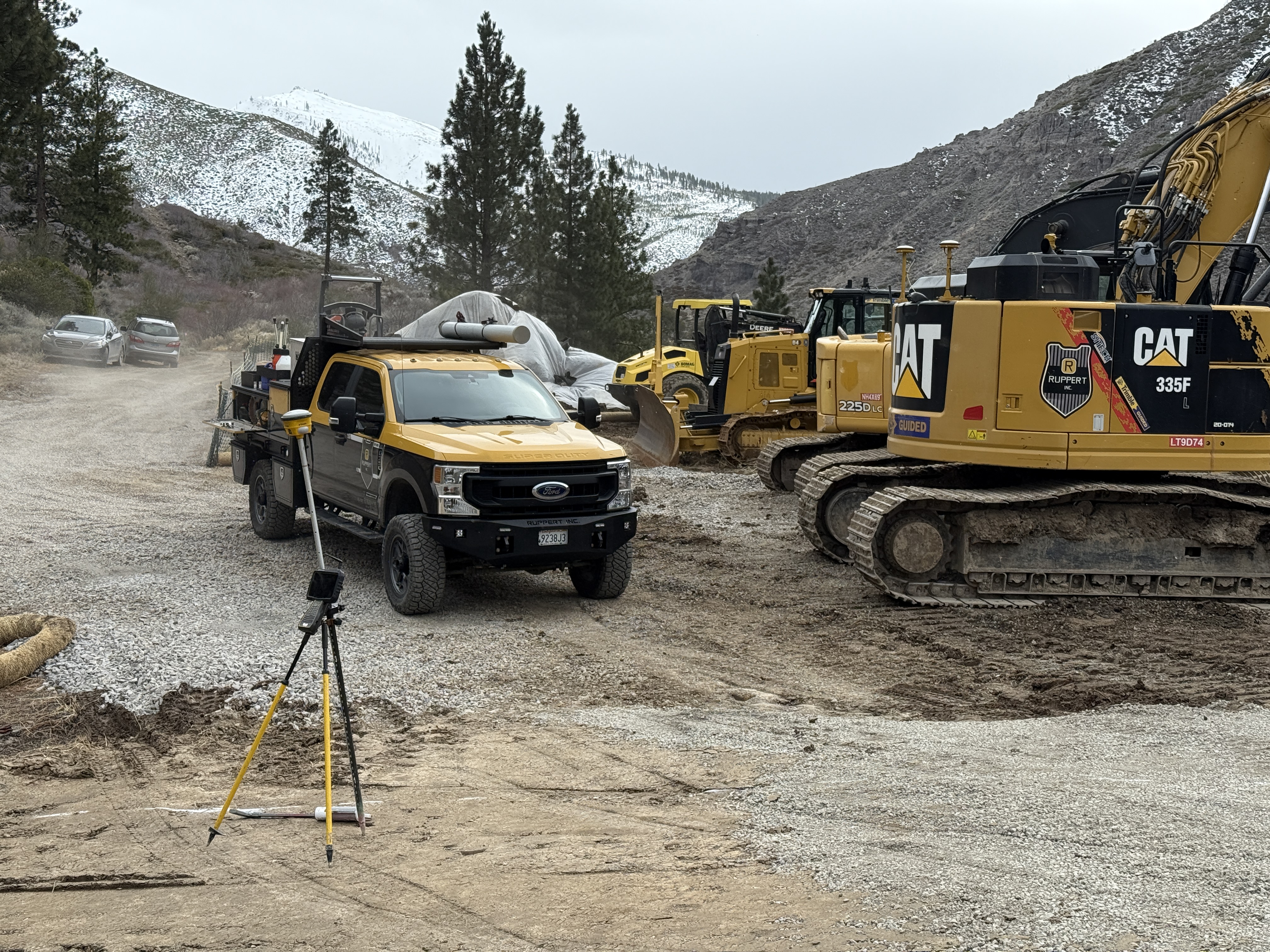 The image shows a construction site with survey equipment set up on a tripod in the foreground, indicating survey layout activity. A Ford truck is parked nearby, along with large CAT excavators and bulldozers. The site is situated in a mountainous area with snow visible on the surrounding hills. The ground appears to be a mix of dirt and gravel, and there are no visible personnel or active work being undertaken.