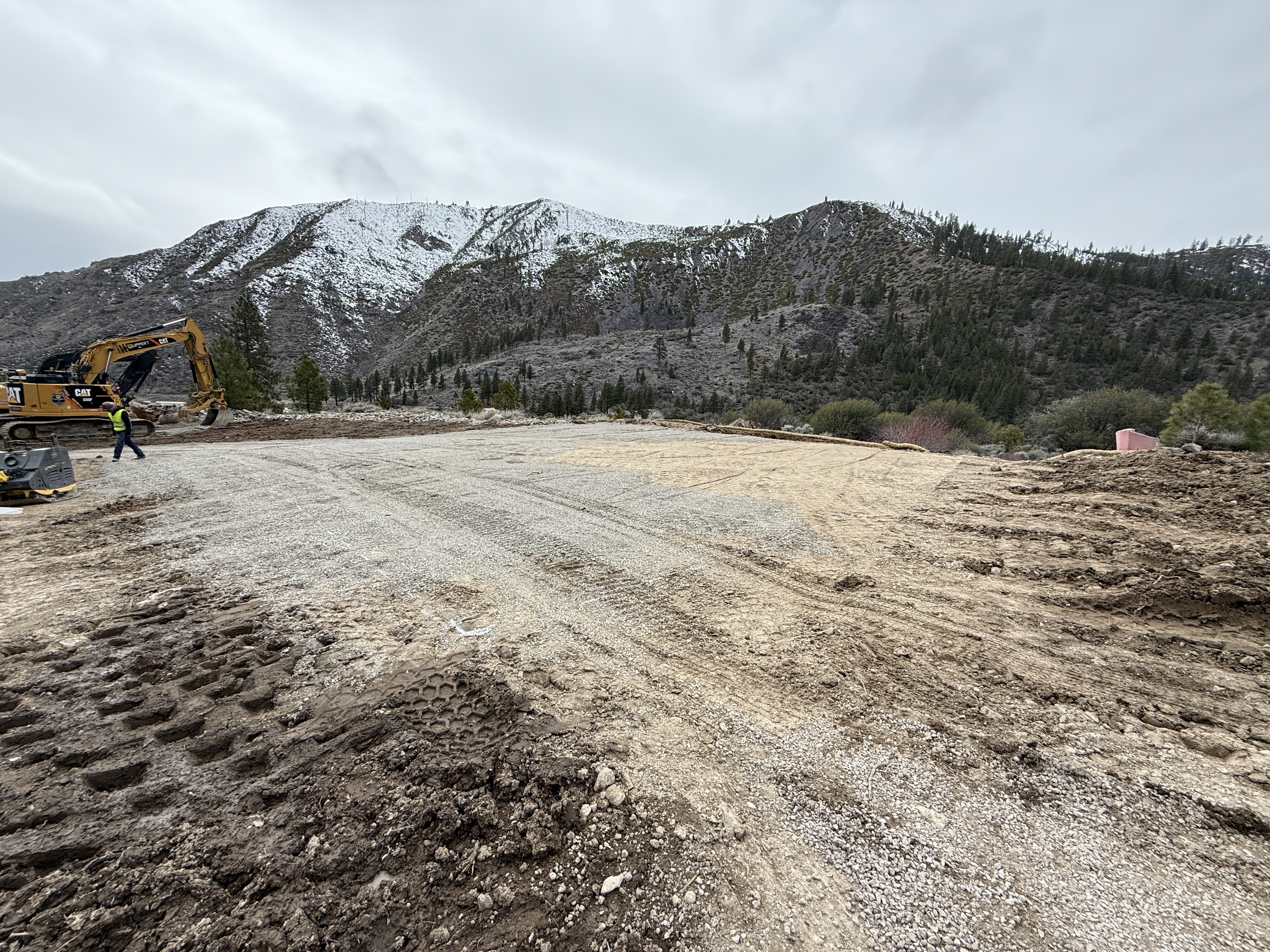 The image shows a construction site in a mountainous area with ongoing site grading. An excavator is stationed to the left in the image, actively working on leveling the ground. The surface appears to be a mix of soil and gravel with visible tire tracks. Snow-covered mountains are visible in the background, indicating cold weather conditions. A worker wearing safety gear is near the excavator.