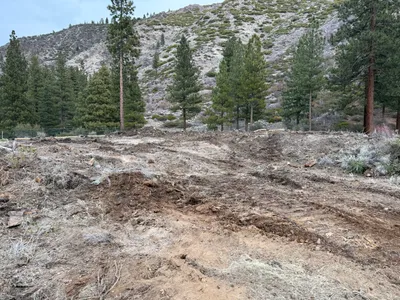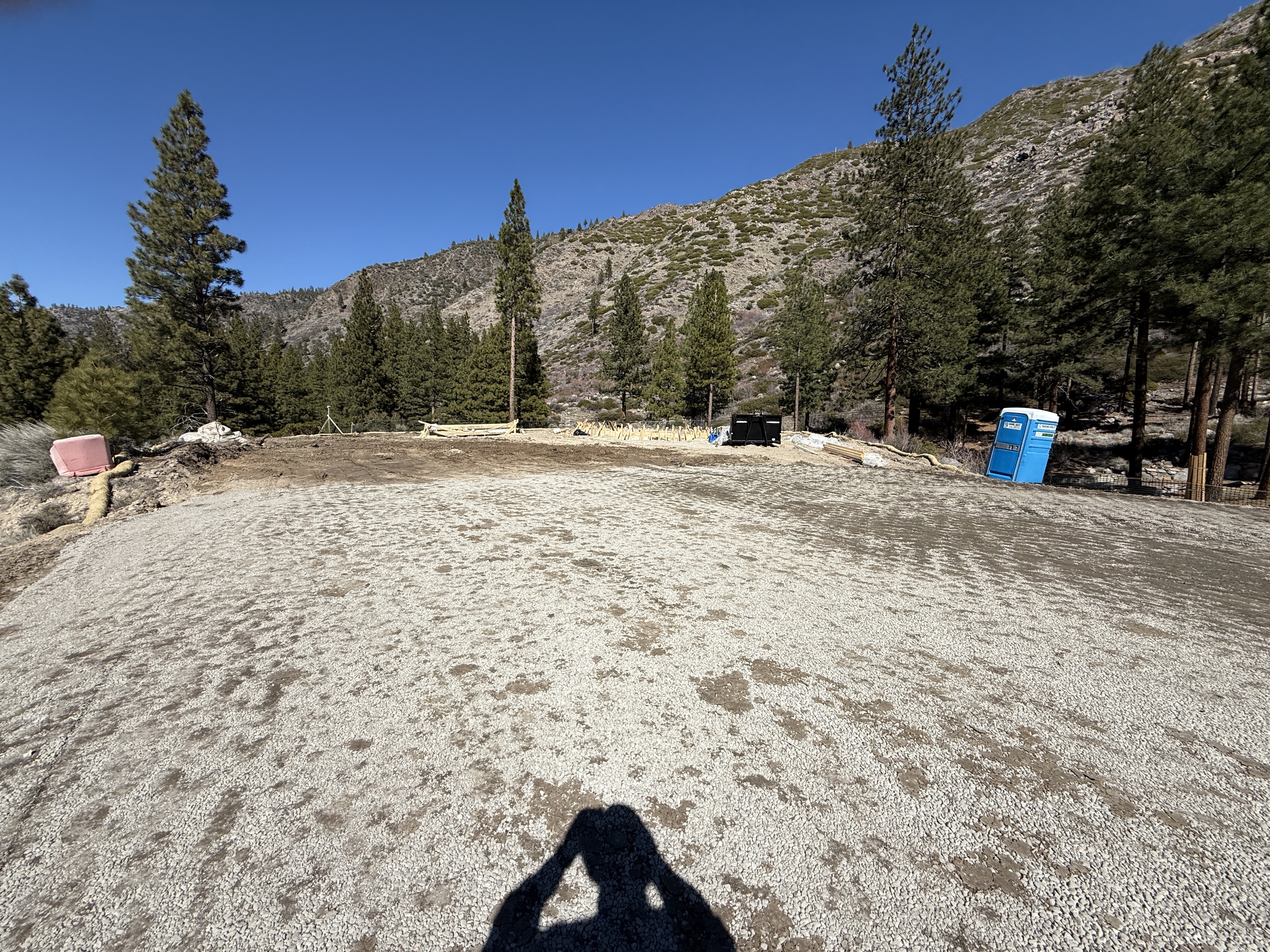 The image shows a construction area with leveled gravel or dirt, indicating site-grading work. A portable toilet and a waste dumpster are positioned in the background near the trees. The area is relatively open with visible tree-lined hills in the distance. No active machinery or personnel are visible in this frame.