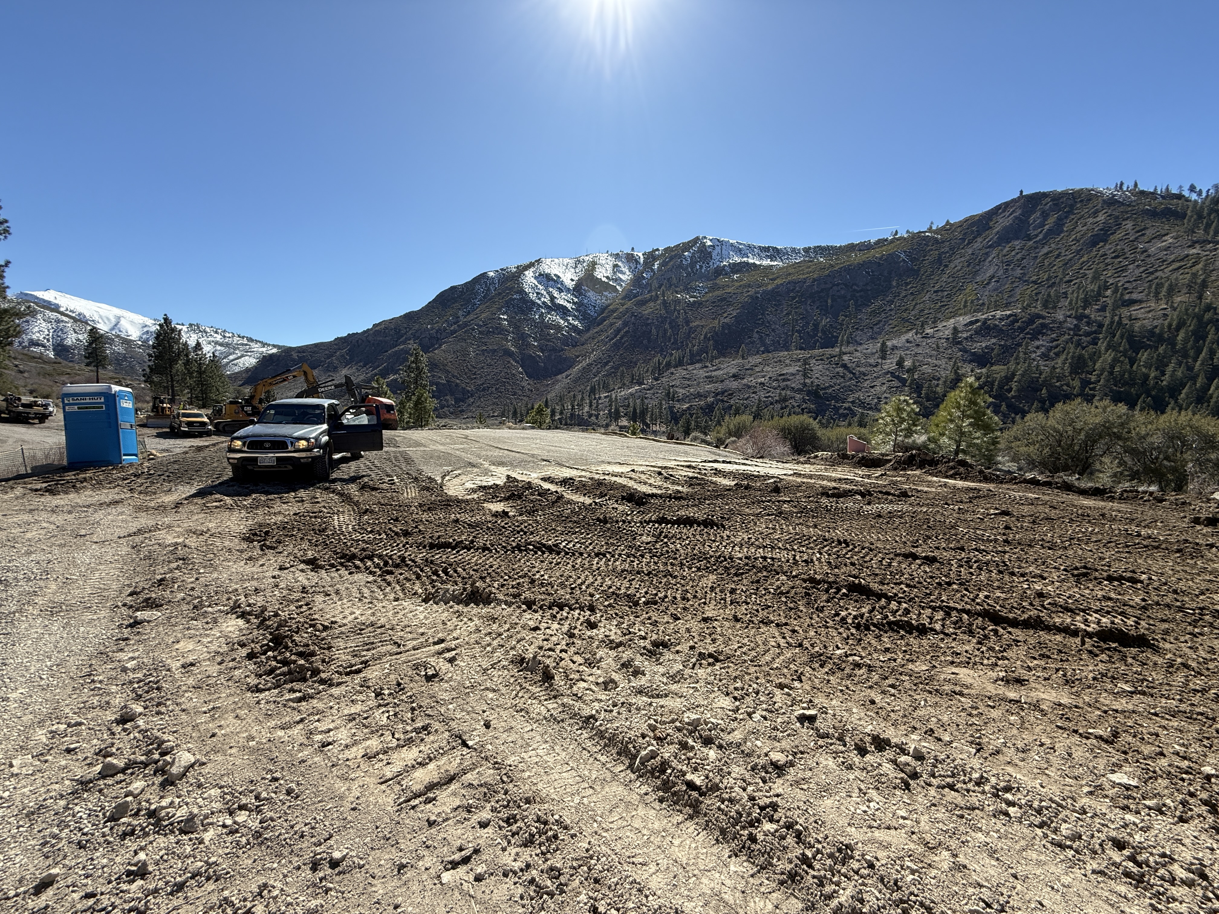 The image shows an active construction site with site grading underway. A black truck is parked on a dirt road with heavy machinery, including an excavator, visible nearby. Portable toilets are positioned to the left, and mountains with snow patches are seen in the background. The sun is shining brightly, creating clear visibility of the site conditions.