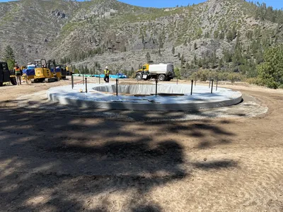 Wooden formwork is constructed in a circular pattern for a tank foundation at the center of the image. Multiple excavators and construction vehicles are visible in the background. The area is surrounded by mountains and trees, suggesting a remote or mountainous location. Soil appears to be excavated around the foundation structure.
