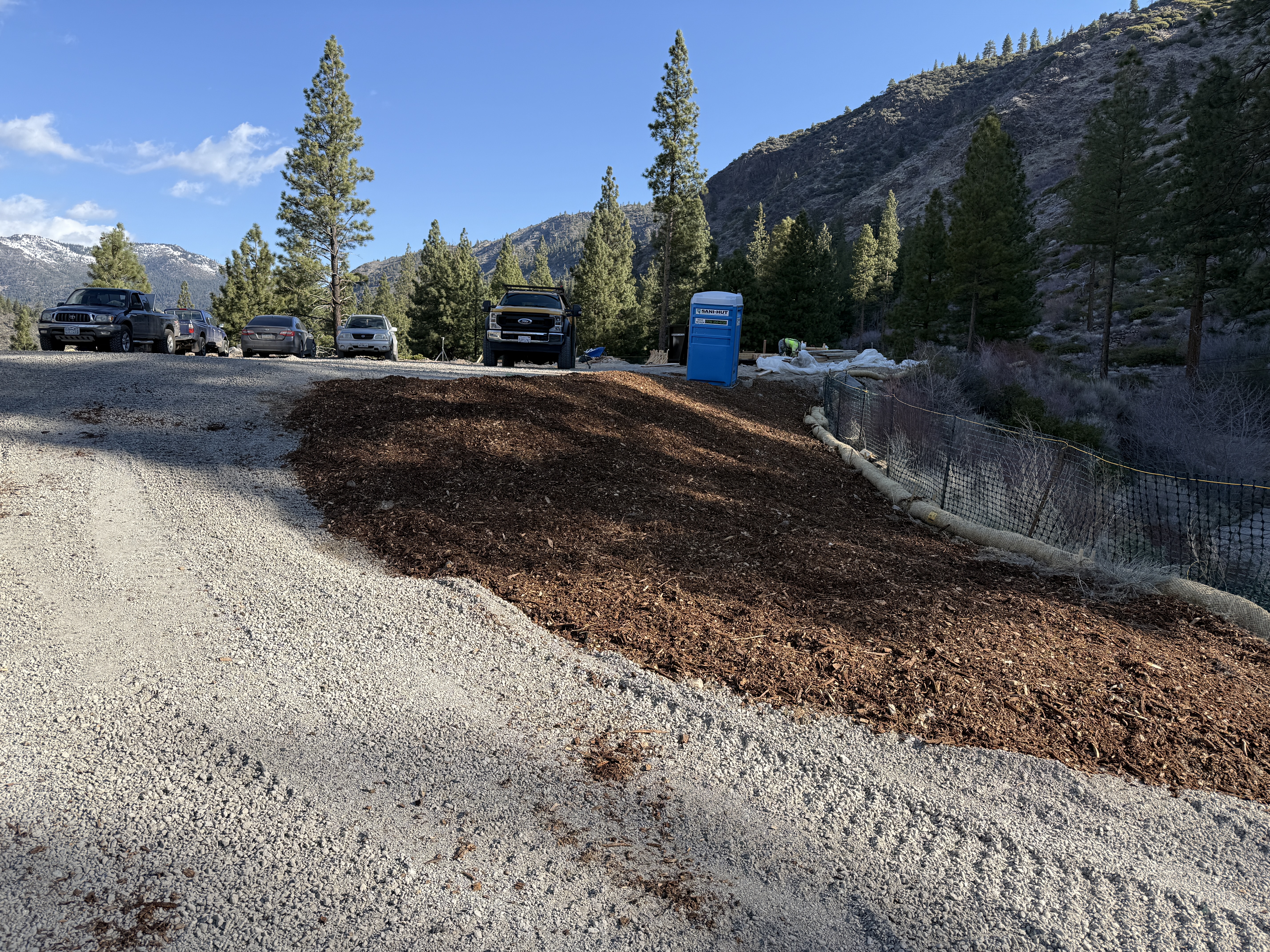The image shows a portable toilet placed on a gravel parking area, with several vehicles parked nearby. Gravel and mulch cover the surface, and erosion control measures like netting and sediment logs are visible along the slope. The area is surrounded by trees and hills, suggesting a mountainous region.