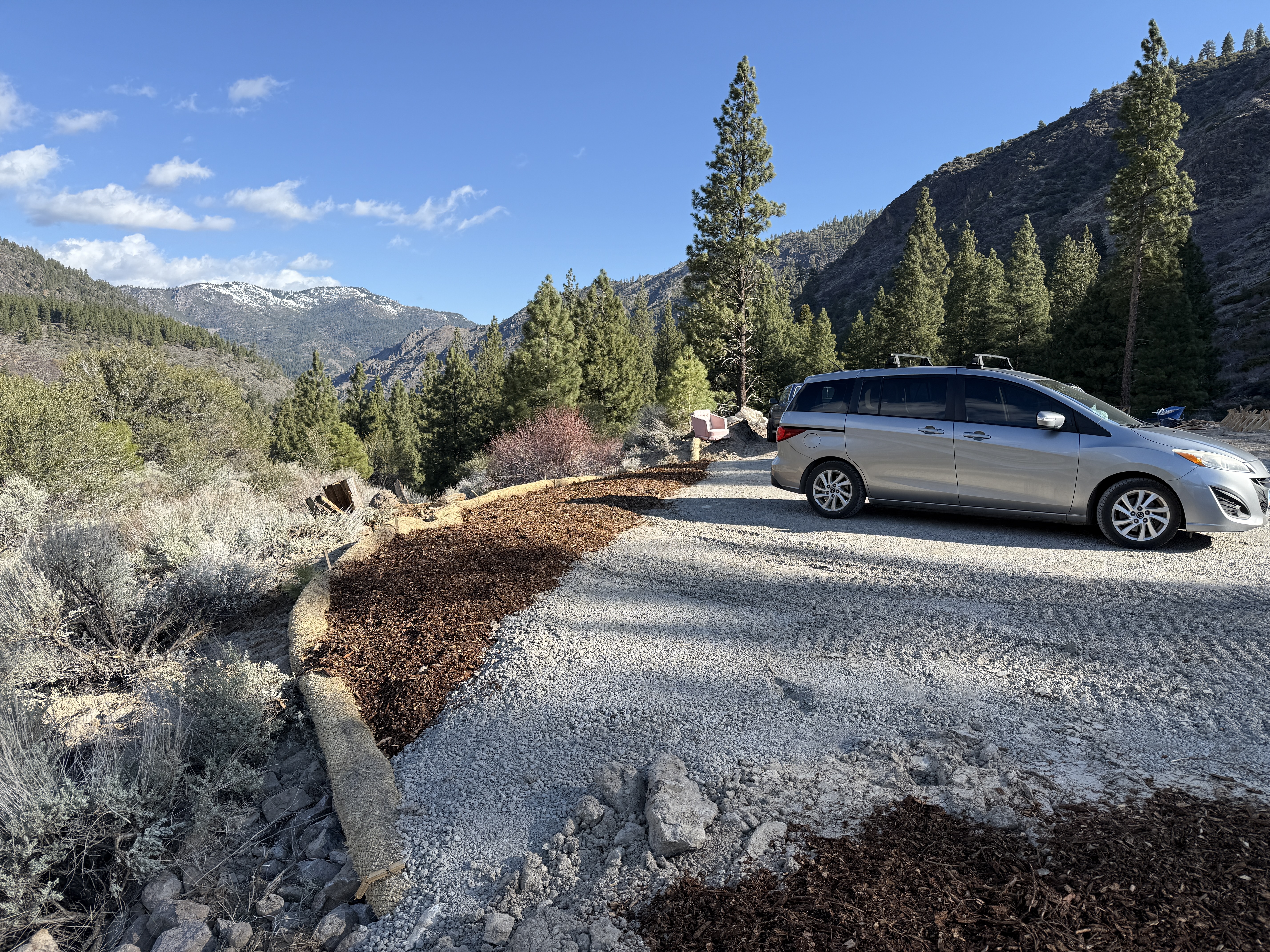 A vehicle is parked on a gravel surface near a construction area with visible erosion control implemented along the edge of the pad. The surrounding environment consists of trees and mountains with clear skies. Gravel covers the parking pad, and a sediment control sock lines the border a bit away from vegetation.