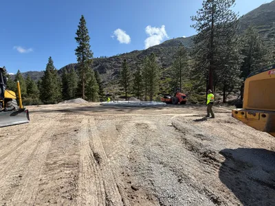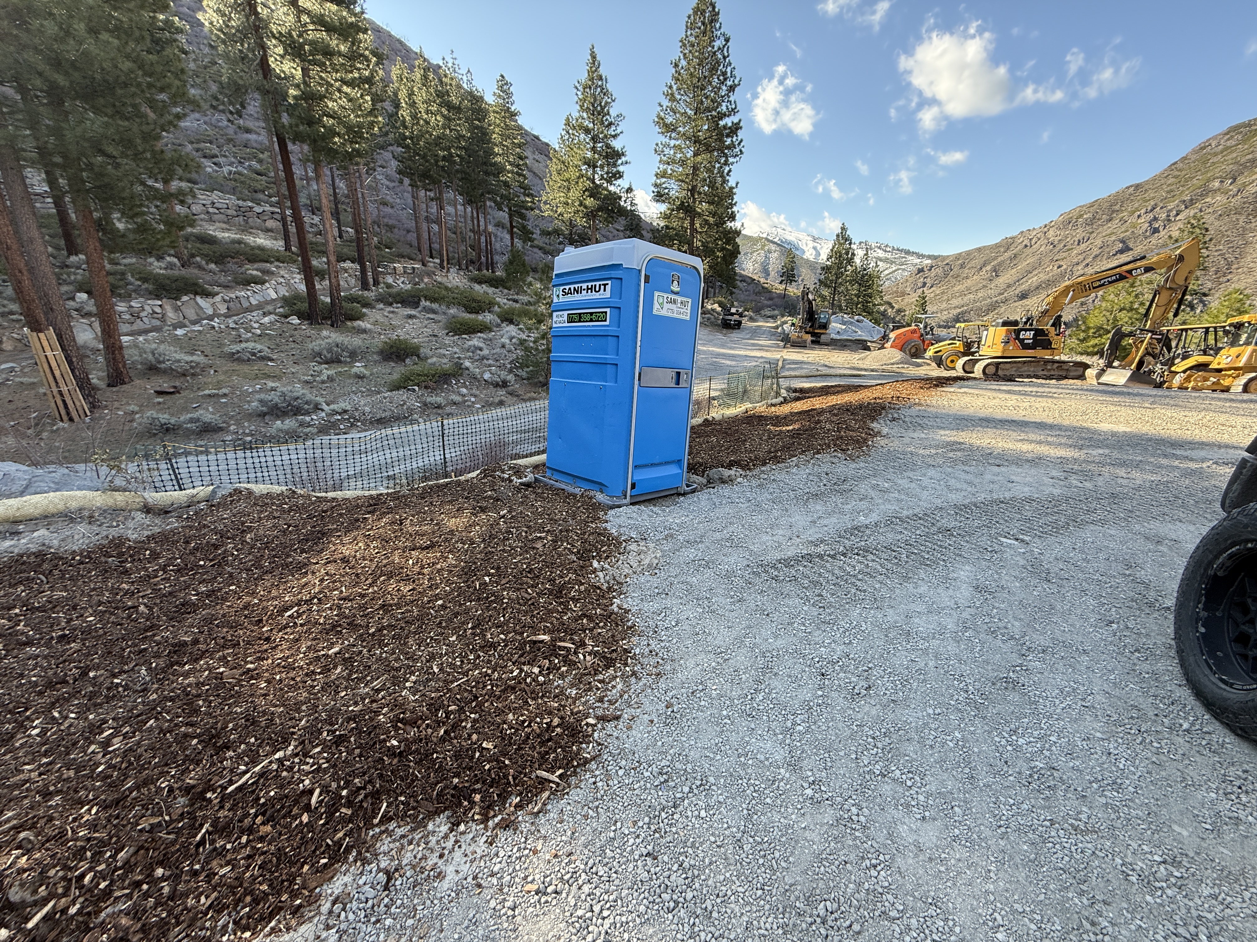 The image shows a construction site located in a mountainous area with heavy machinery such as excavators and earthmovers present. A blue portable toilet is positioned to the left side of the frame. A gravel access path runs through the site, lined with wooden mulch on one side. The area appears to be prepared for further construction activity.