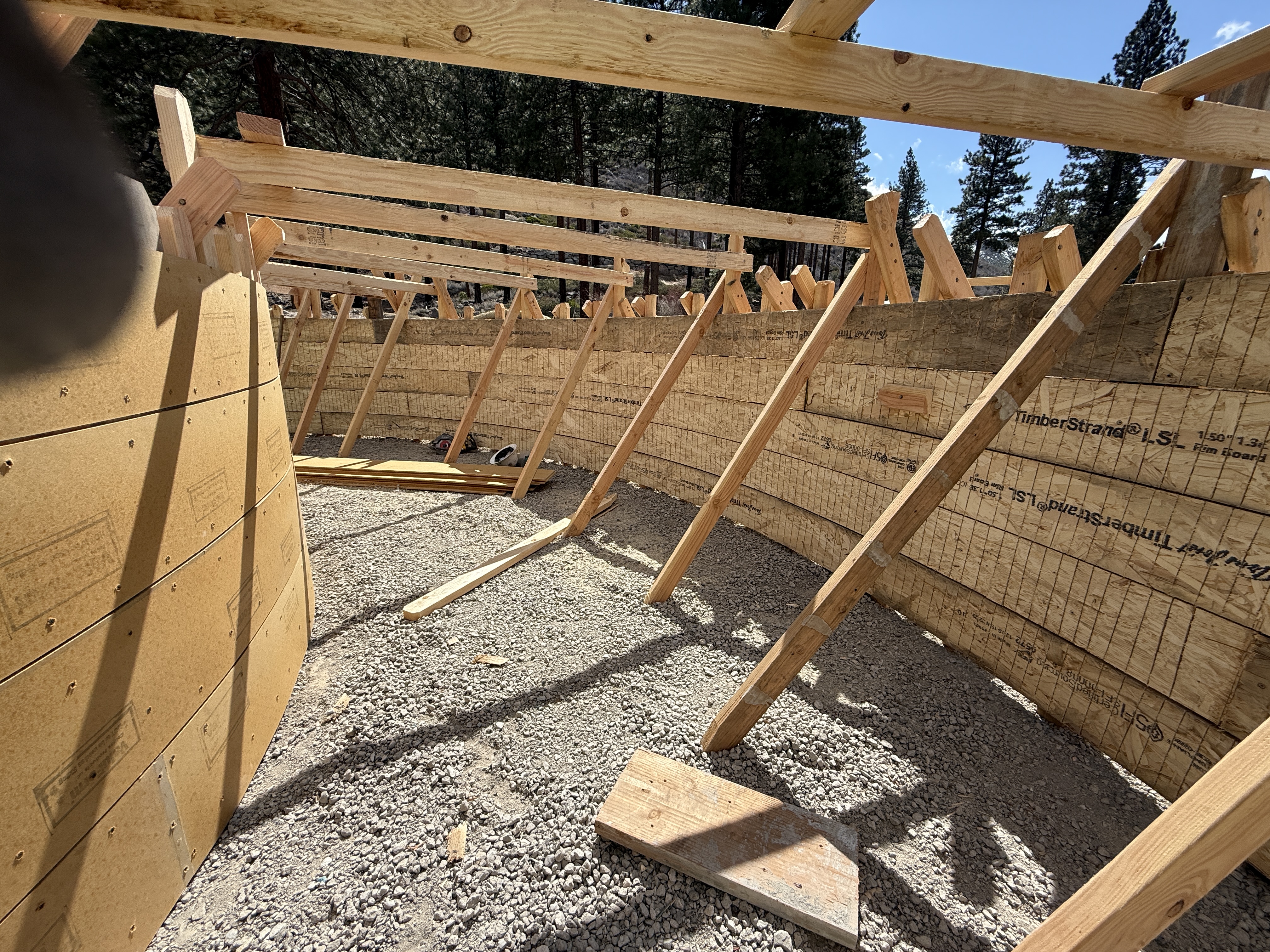 The image shows the interior view of a wooden formwork structure for a likely circular tank foundation. Wooden beams are supporting the vertical panels, which are lined into a curved shape. The ground inside the formwork is covered with gravel, indicating preparation for concrete pouring. Timber beams are visibly angled to provide structural support.
