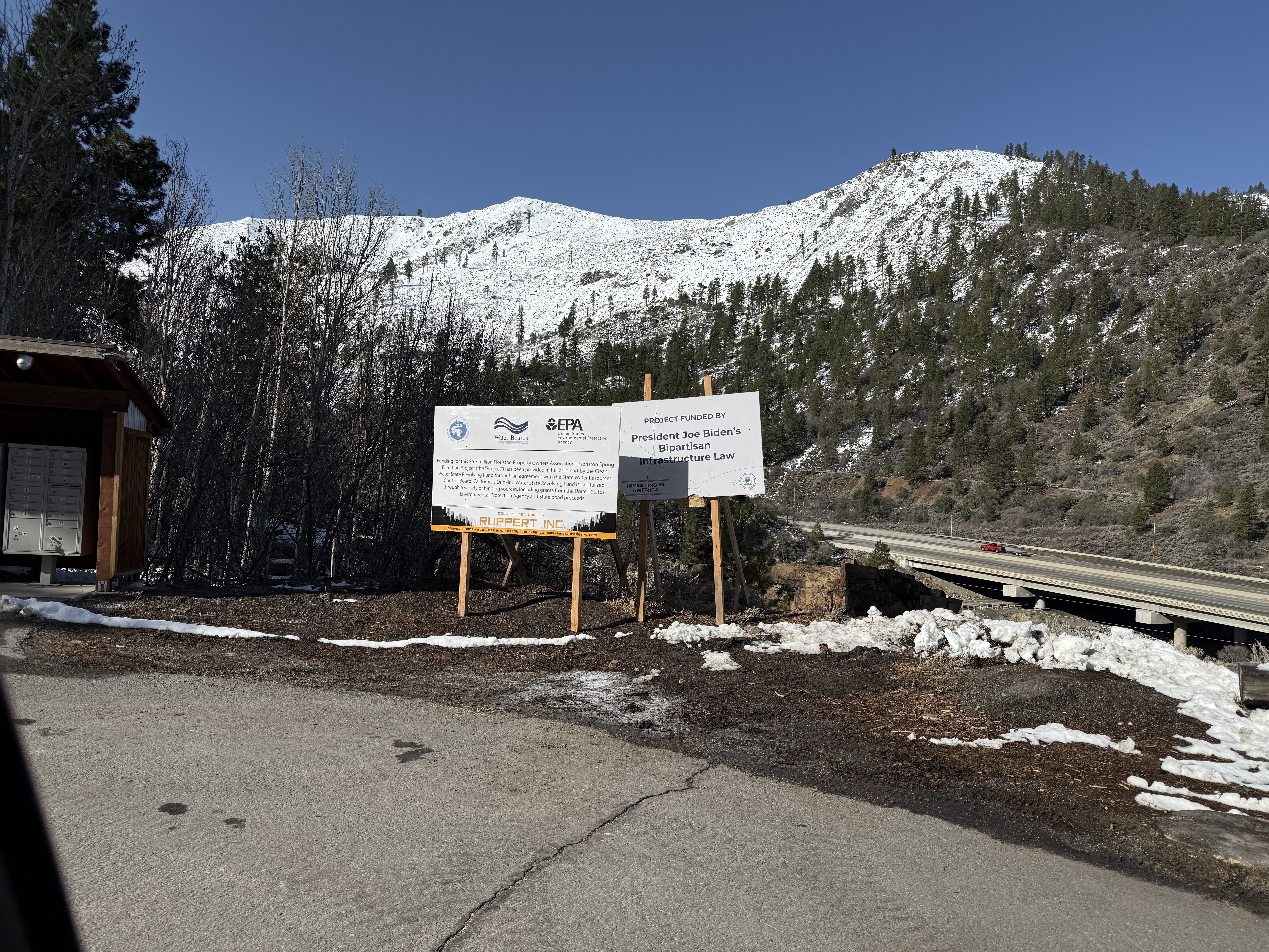 The image shows a project sign prominently located near a roadway with snow-covered hills in the background. The sign mentions funding by President Joe Biden’s Bipartisan Infrastructure Law. A road with a bridge and a red car is visible to the right. Additionally, a small wooden structure with mailboxes is present on the left.