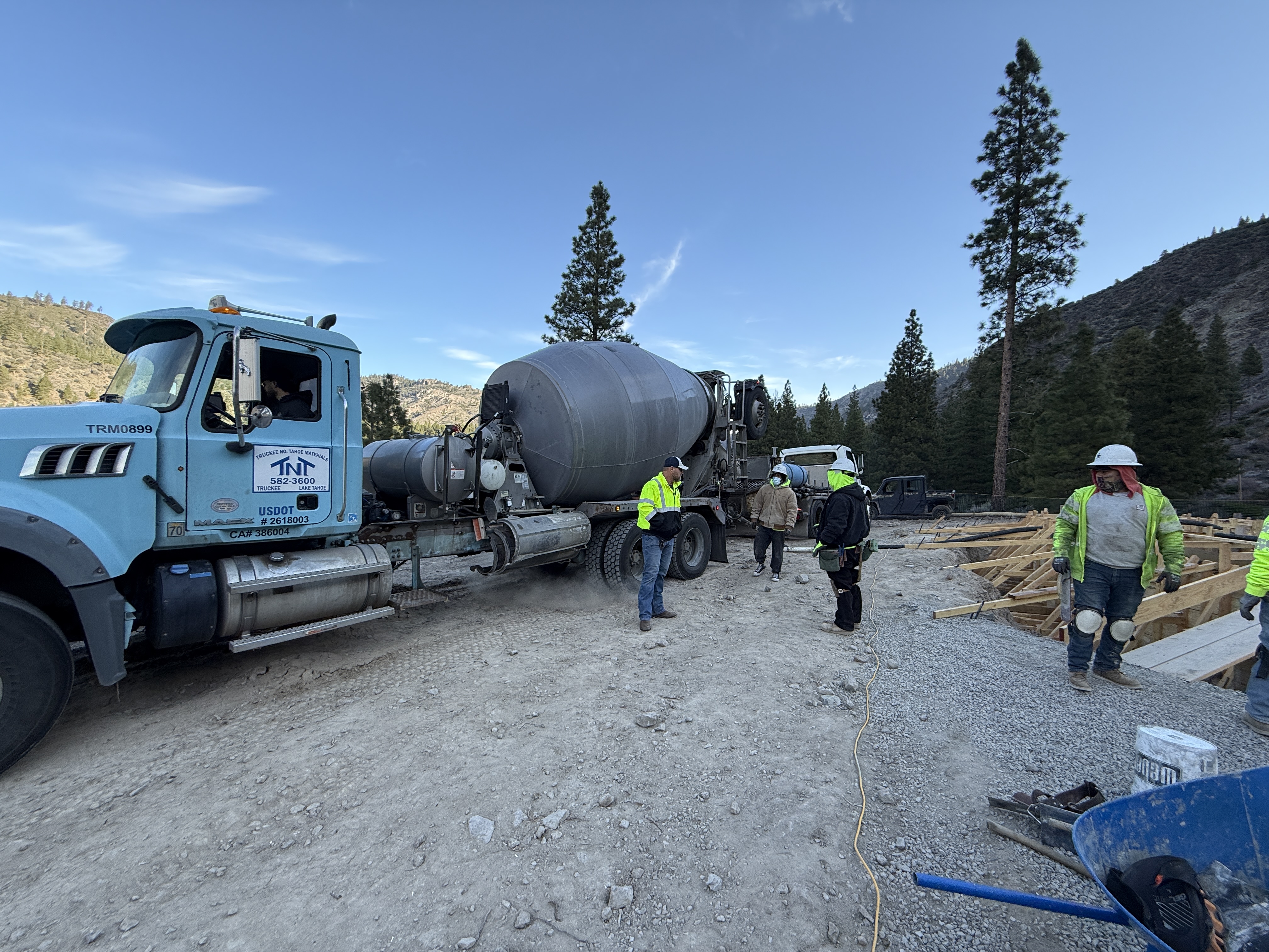 The image shows a concrete mixer truck with workers standing nearby wearing safety gear. Workers appear to be engaged in preparing for or delivering concrete to a construction area. The site is surrounded by dirt and gravel, with wooden formwork structures visible on the ground.