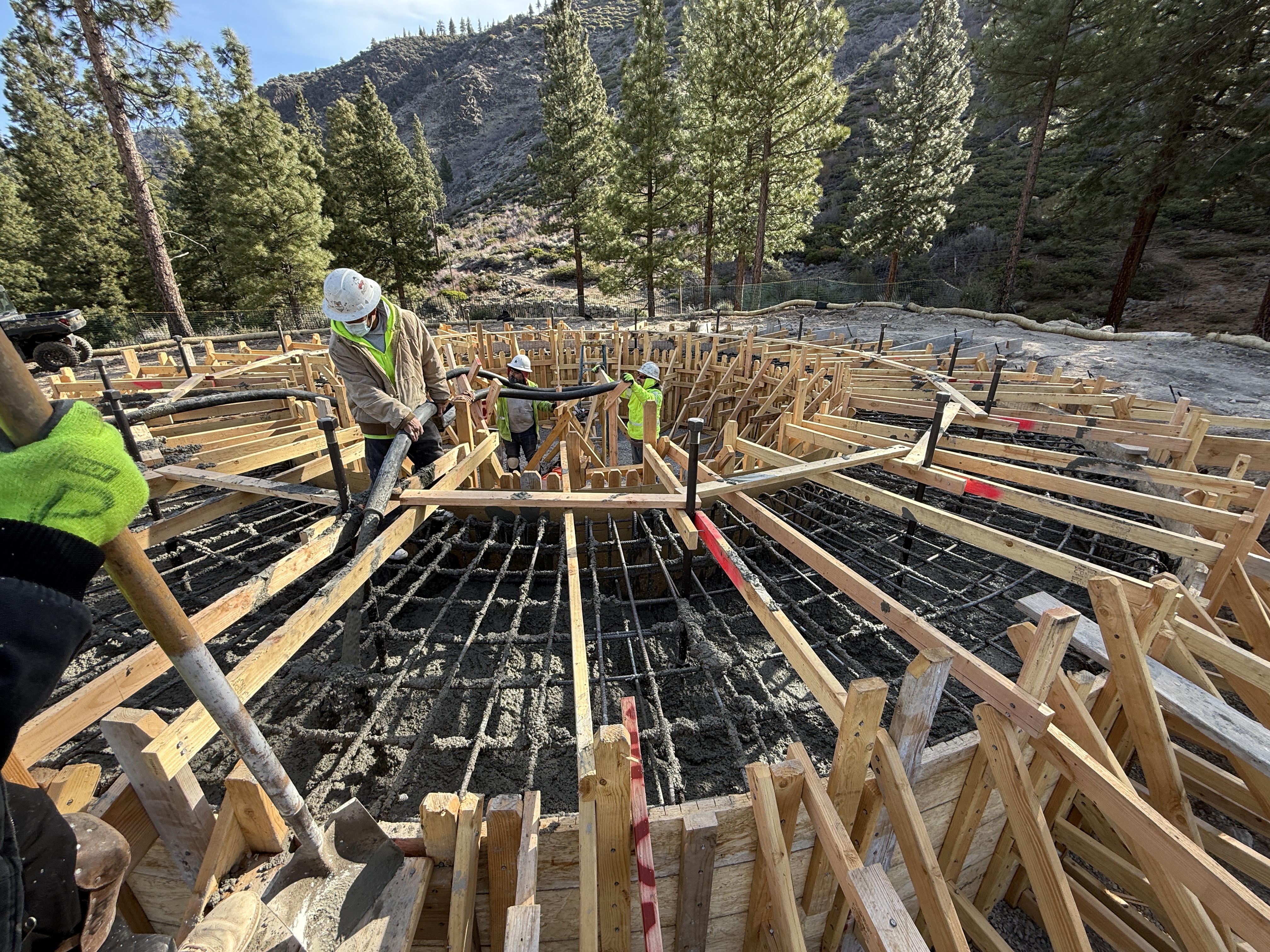 The image shows workers pouring concrete into a wooden formwork structure stabilized by a dense network of rebar. They are working on what appears to be a circular foundation or pad in a wooded area. Workers are using hoses to distribute the concrete while others manage it with shovels. The setting is outdoors with trees and a hilly landscape in the background.