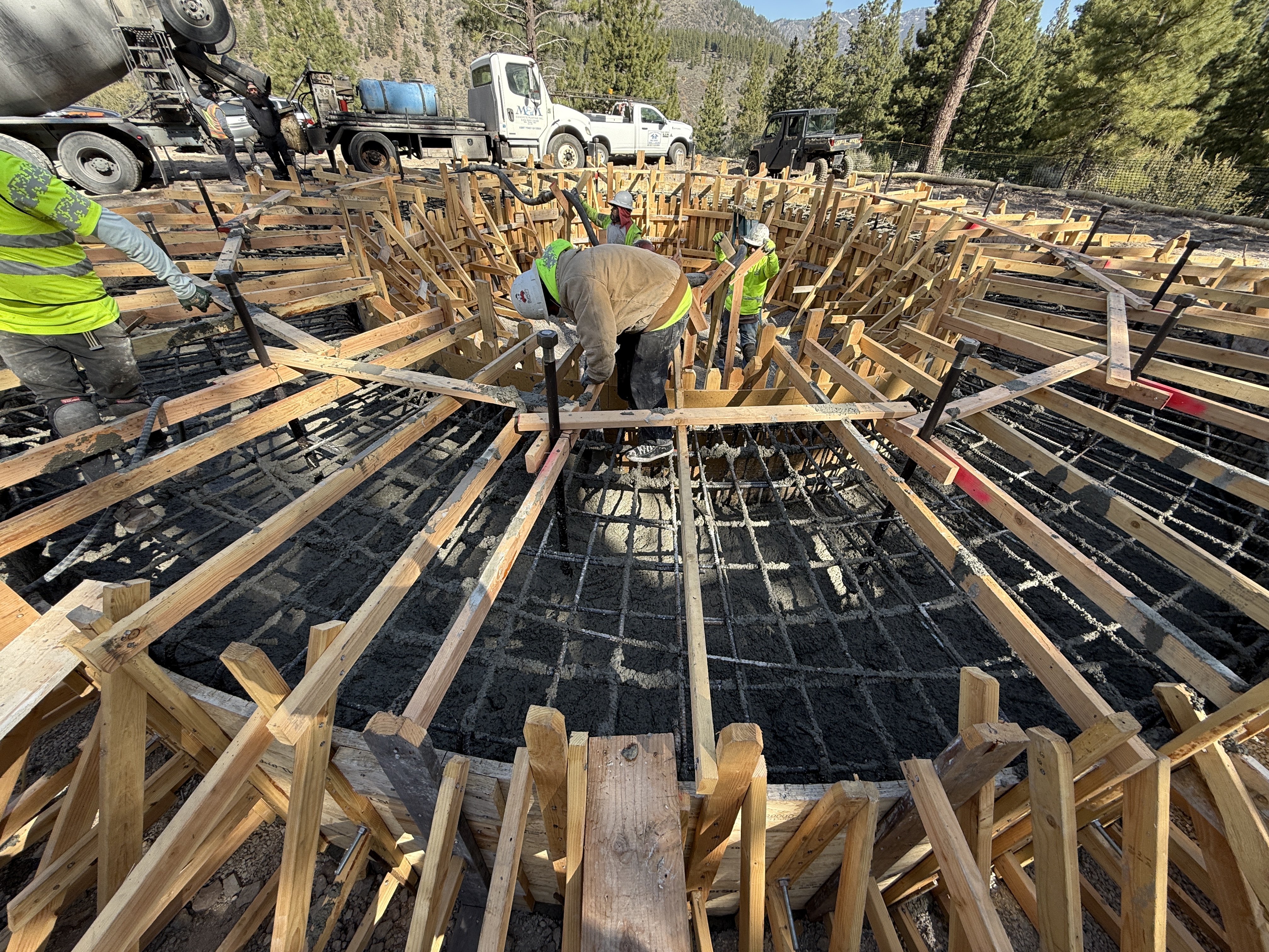 The image shows several construction workers engaged in pouring concrete over a circular rebar structure within wooden formwork, suggesting a foundation task. The rebar is arranged in a circular grid, and wooden braces support the structure. The presence of concrete trucks indicates active concrete work. The outdoor setting is surrounded by trees and natural terrain.