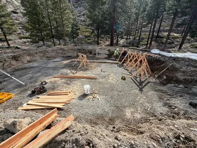 The image shows construction workers on a job site wearing safety gear while pouring concrete into formwork containing rebar. The formwork is supported by wooden braces and surrounds a rectangular area. Several concrete mixer trucks are positioned nearby, indicating an active pour. Trees and rocky terrain are visible in the background, suggesting a mountain or forest area.