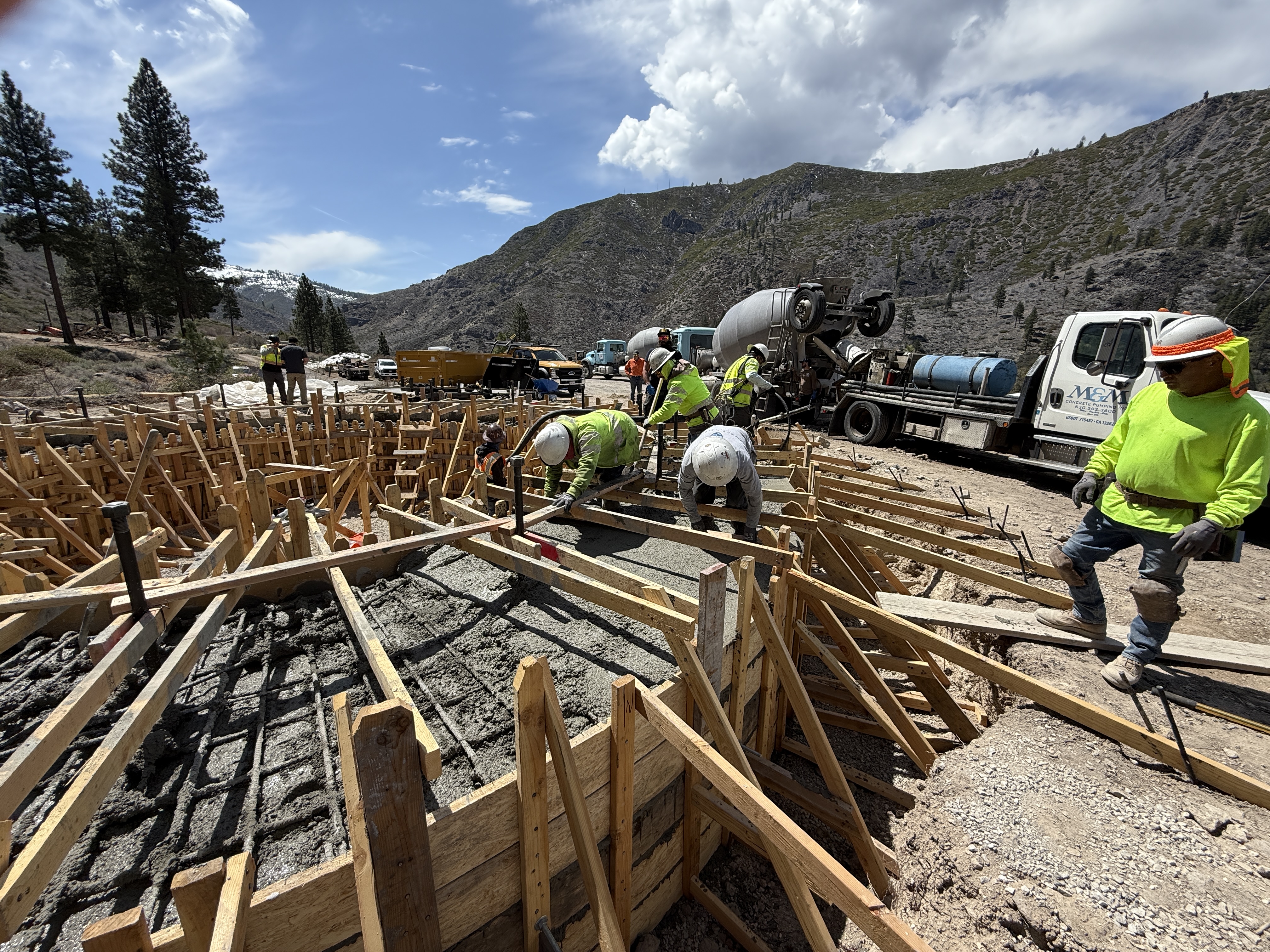 The image shows workers pouring concrete into wooden formwork reinforced with rebar. They are on a construction site with mountainous terrain in the background. A concrete mixer truck is parked on the right side, and several workers are directing operations. Workers are wearing PPE and there are visible construction materials like wood and rebar.