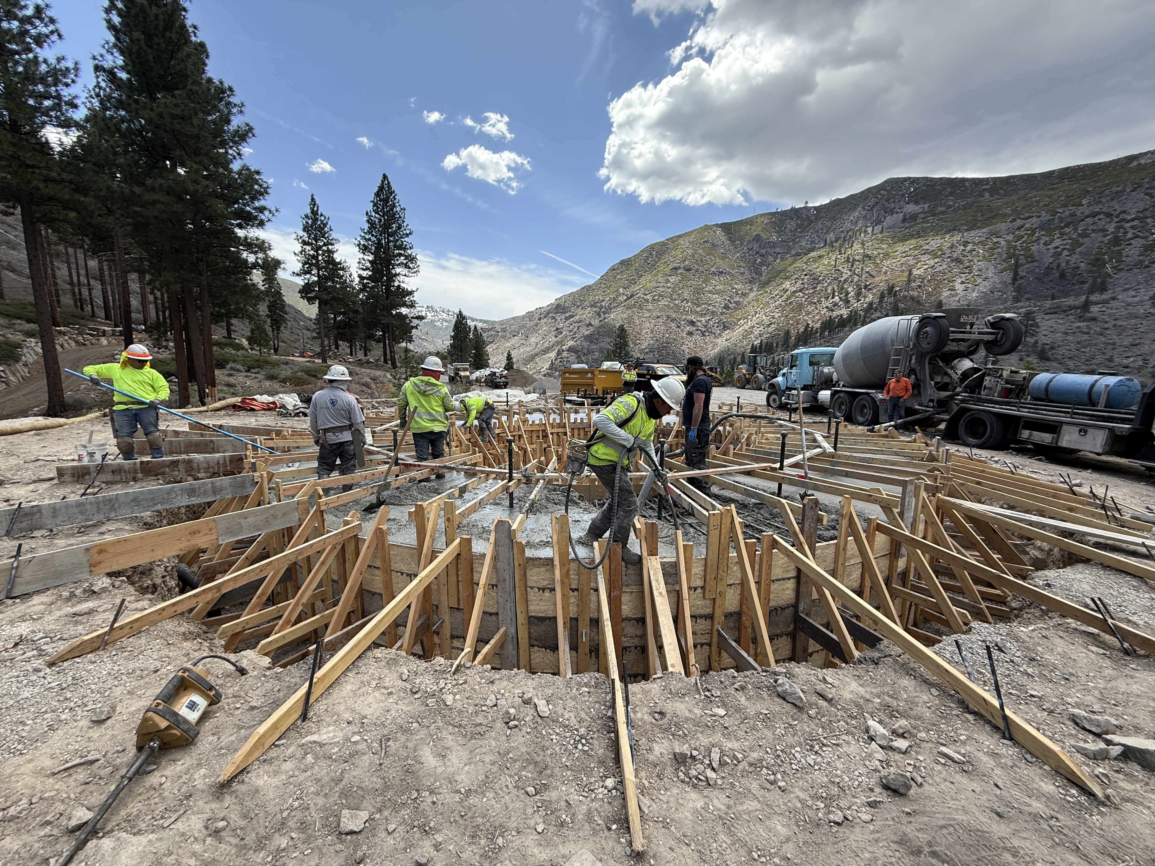 The image shows a construction crew conducting concrete pouring on a tank foundation area. Several workers are actively engaged, using hoses to place concrete within large wooden formwork structures. A concrete mixer truck is parked nearby, with workers guiding the pouring process. The surrounding area is mountainous with loose soil and some trees in the background.