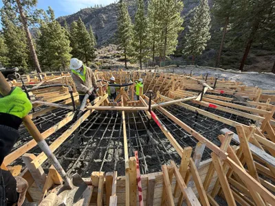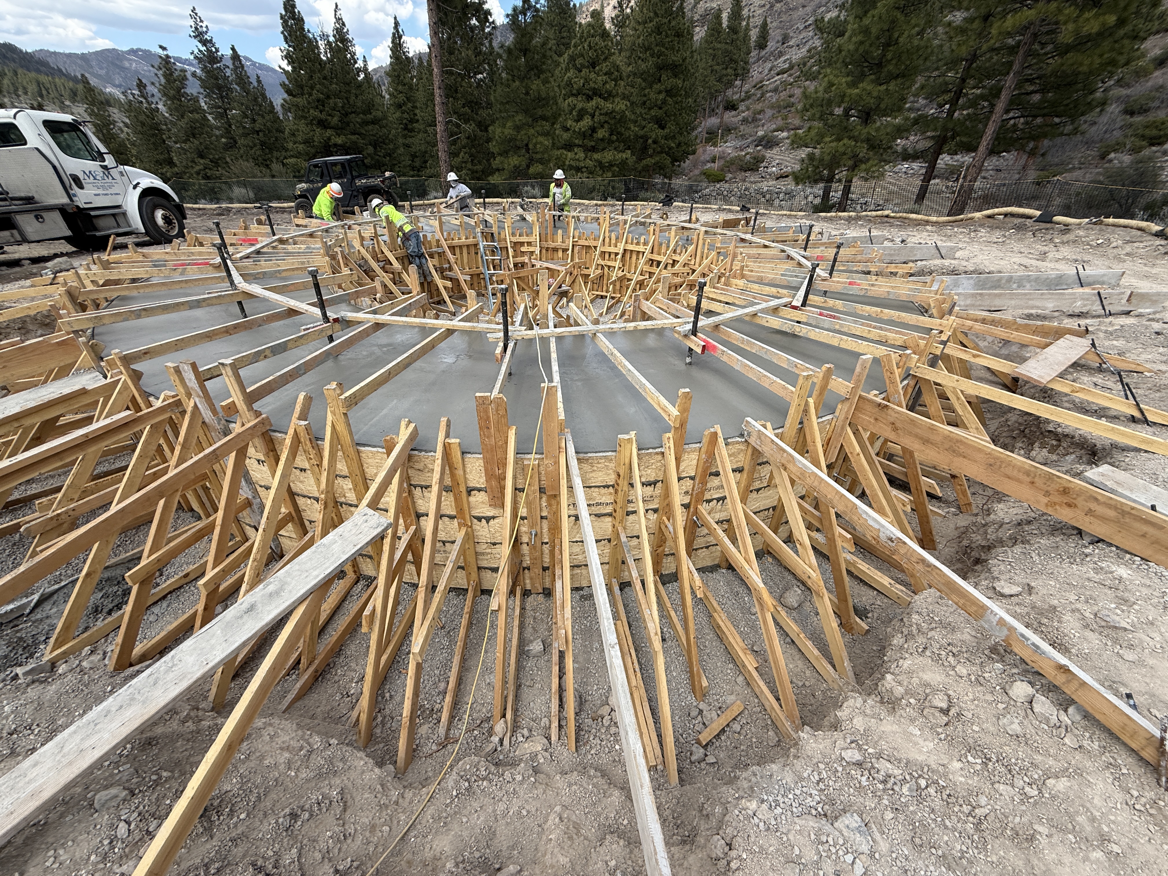 The image shows a circular construction site with workers positioned around the perimeter of a circular formwork. Wooden braces and supports are used to stabilize the formwork structure. A partially filled concrete area is at the center surrounded by wooden framing. Trees and natural terrain are evident in the background, indicating a remote or semi-rural location.