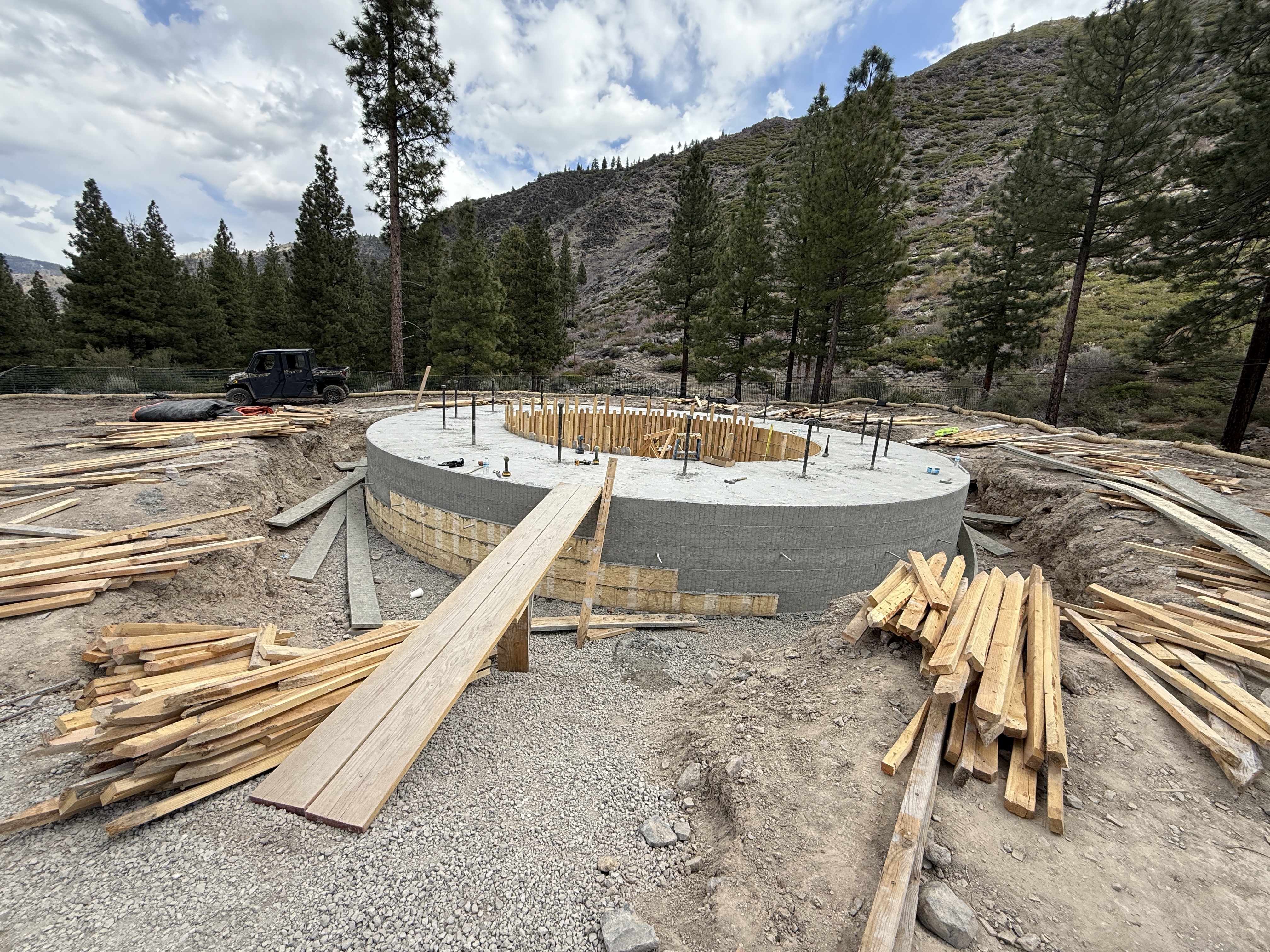 A large circular concrete foundation is visible, surrounded by lumber used for formwork. The foundation is set in an outdoor location characterized by dirt and gravel. Rebar is protruding from the concrete, indicating ongoing or upcoming structural work. Piles of wood and a vehicle are visible nearby, suggesting construction activity.