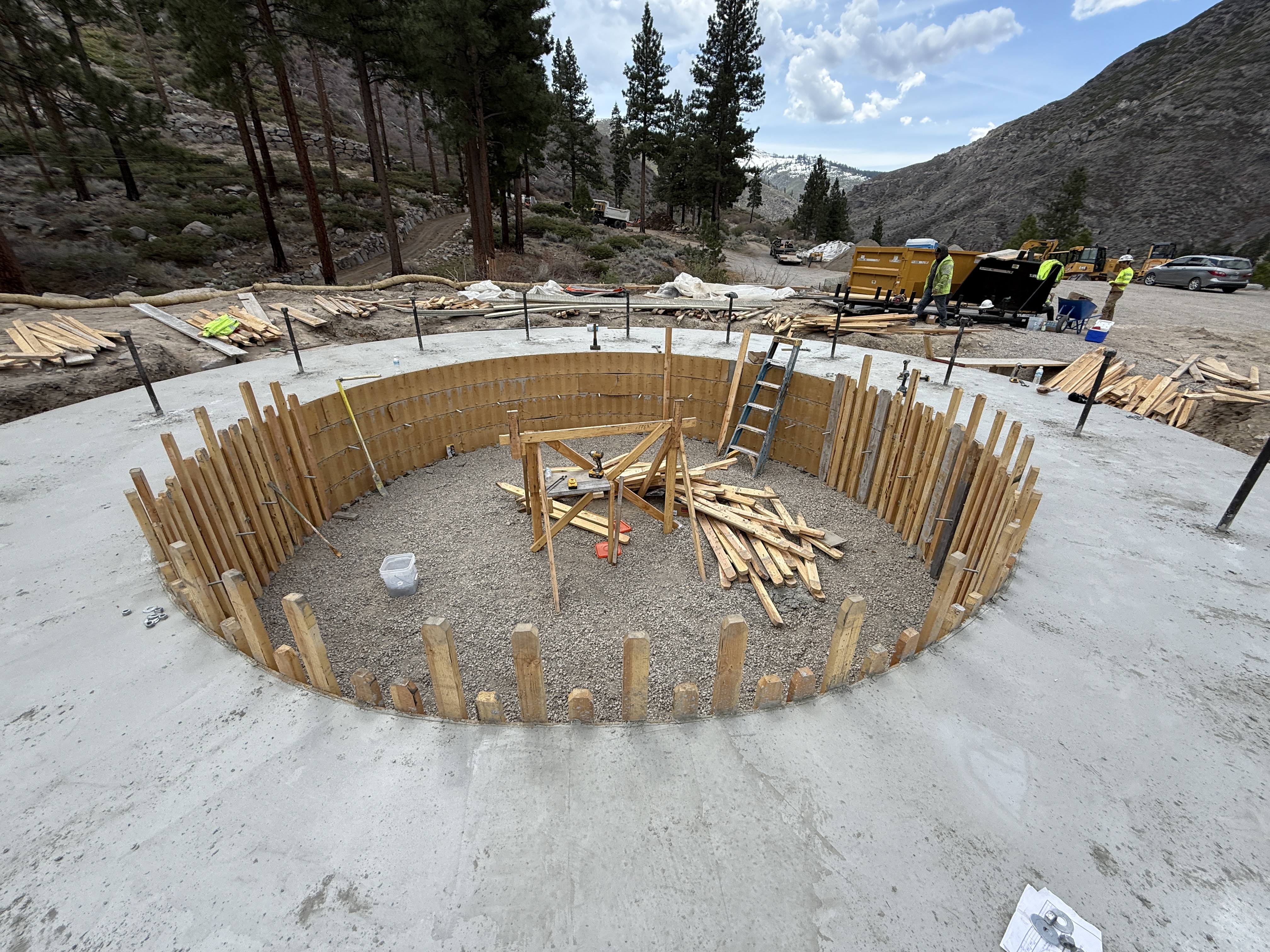 The image shows circular wooden formwork being assembled for a tank foundation. Gravel is placed inside the formwork structure, indicating an early stage of foundation work. Workers and a step ladder are present, indicating active work. Vehicles and a construction trailer are visible in the background, suggesting material transport and site management activities.