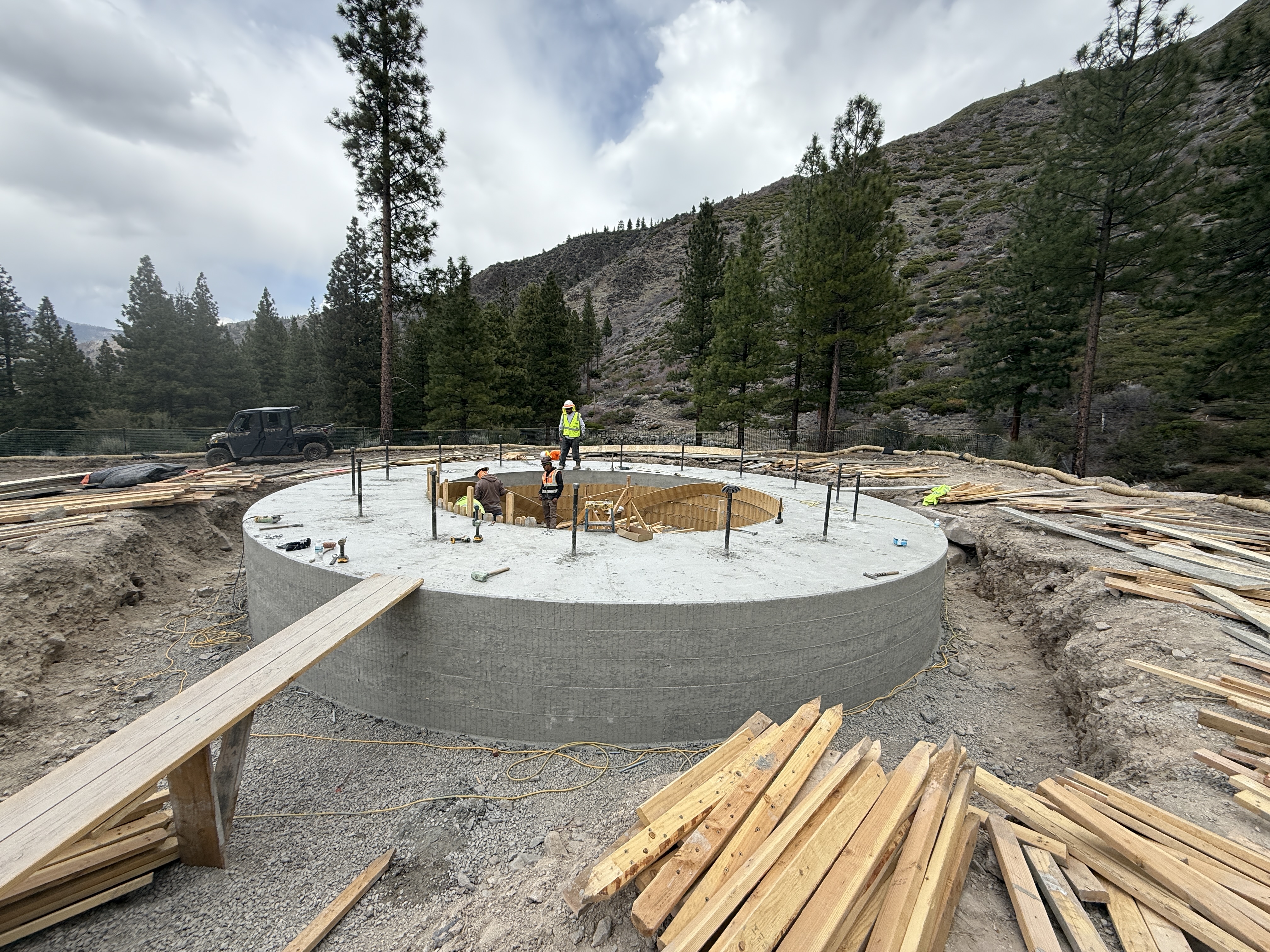 The image shows a construction site with a circular concrete foundation for what appears to be a tank. Rebar is sticking out from the concrete structure, and workers in protective gear are present within the site. Surrounding the area are wood planks and construction material. The site is set in a hilly, forested landscape with a vehicle parked nearby.