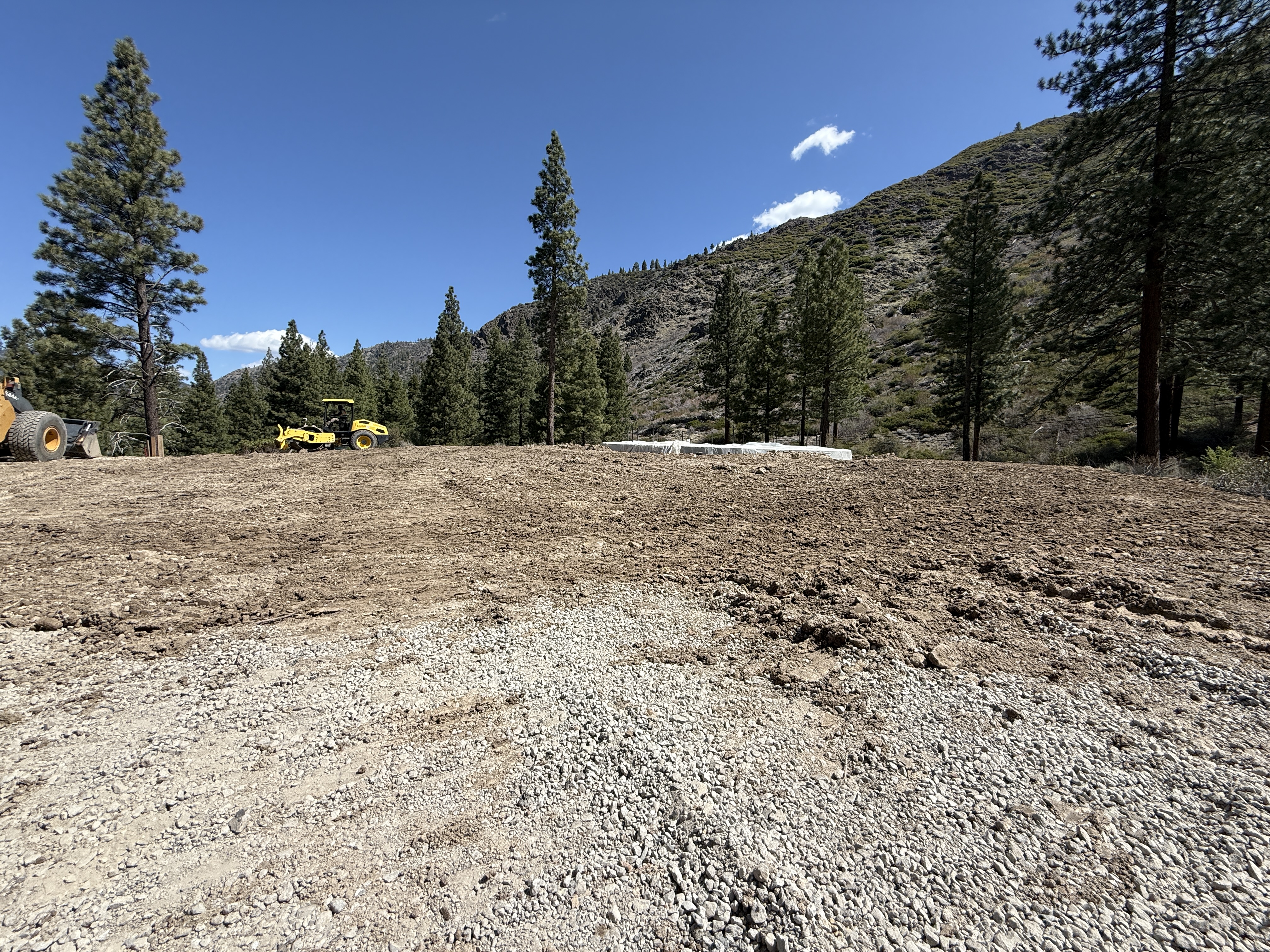 The image shows a cleared area with a dirt surface in a forested region. A roller vehicle is positioned centrally on the graded site, with a larger earth-moving machine partially visible on the left side. Gravel is seen in the foreground, likely for surface preparation or access paths.