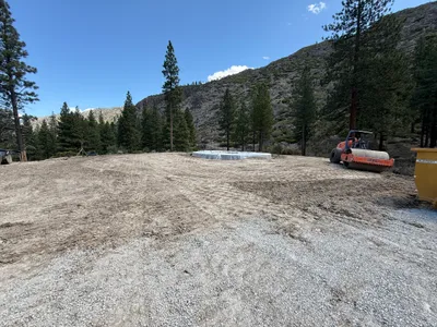 The image shows a construction site with site grading activities in progress. A roller compactor is positioned on the right side of the image, indicating soil compaction work. Mixed gravel and soil cover the surface in the central area, suggesting recent or ongoing grading operations. The environment is surrounded by trees and hills with clear weather conditions.
