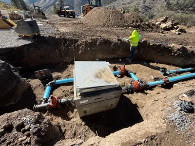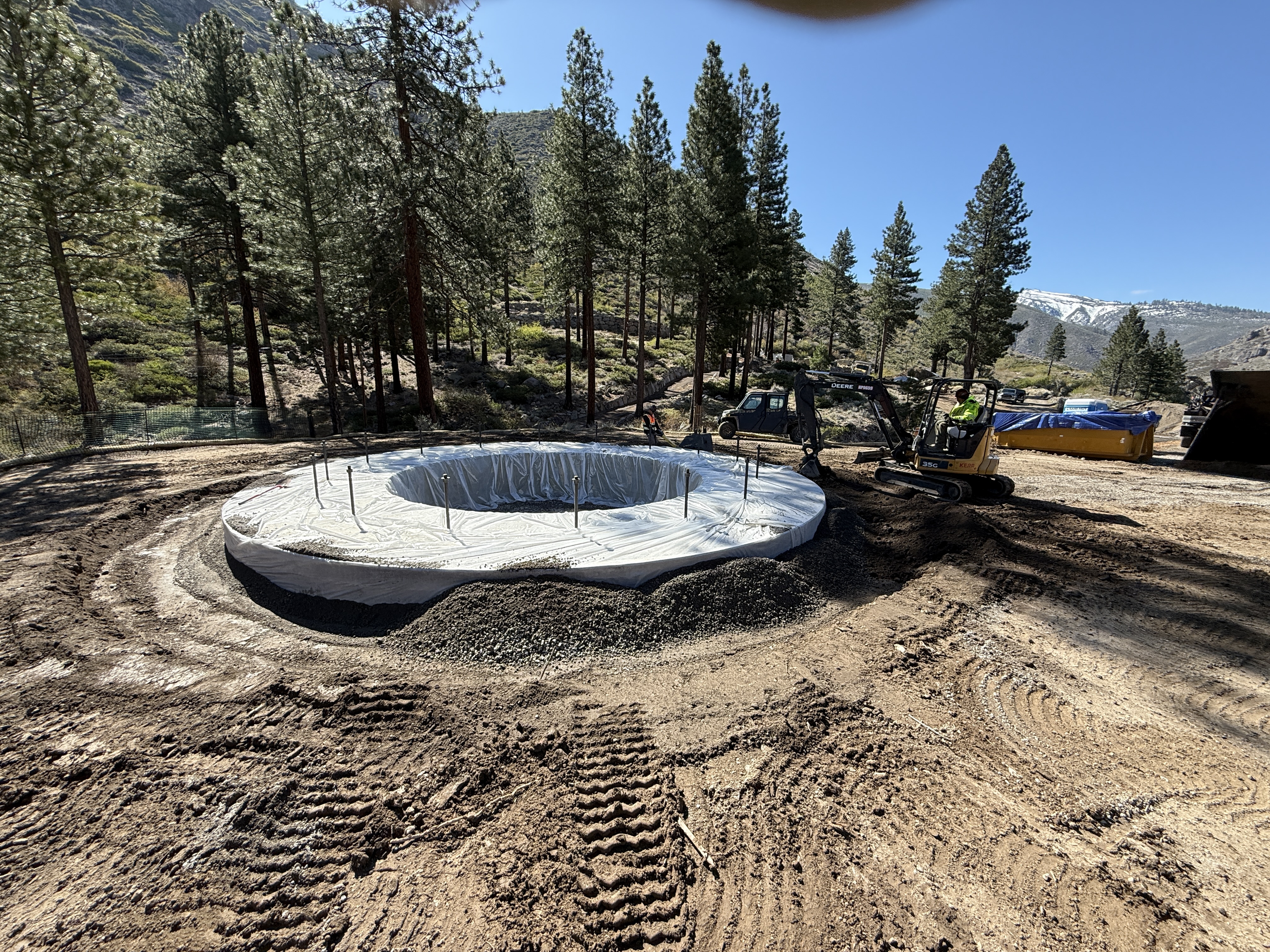 The image shows a tank foundation preparation area with a circular section covered by a white geotextile or protective cover, likely for foundation stabilization. A mini excavator is seen actively working near the edge of this area. Surrounding the central section are mounds of gravel, suggesting ongoing or preparation for backfill activities.