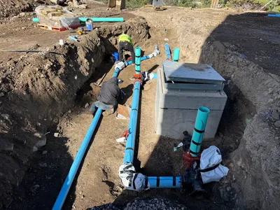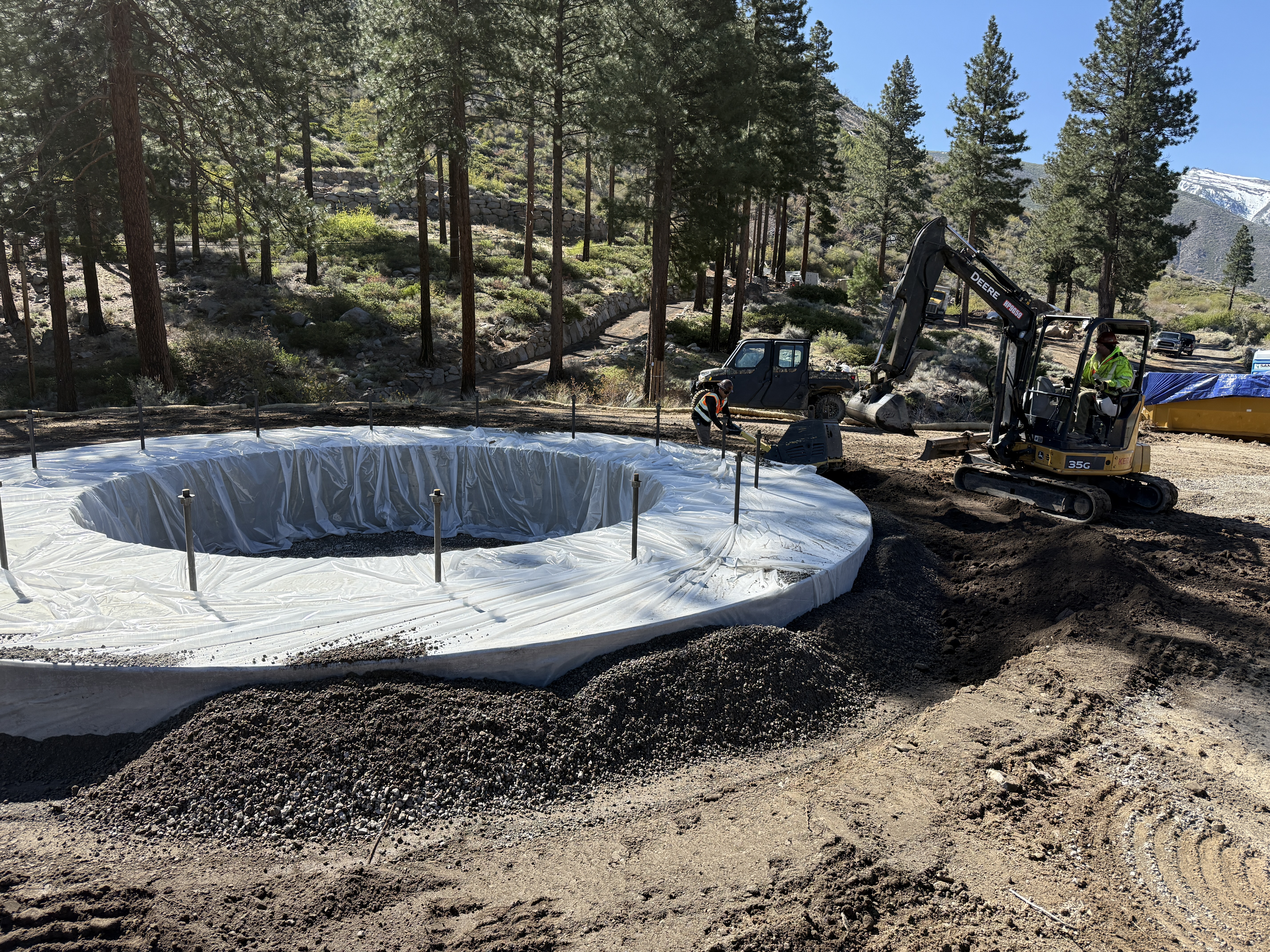 The image shows a backfilling operation around a circular structure covered with a tarp or liner. An excavator is actively moving soil around the perimeter of the structure. There is a pile of gravel material next to the structure. Workers are present, and small construction vehicles are parked nearby.