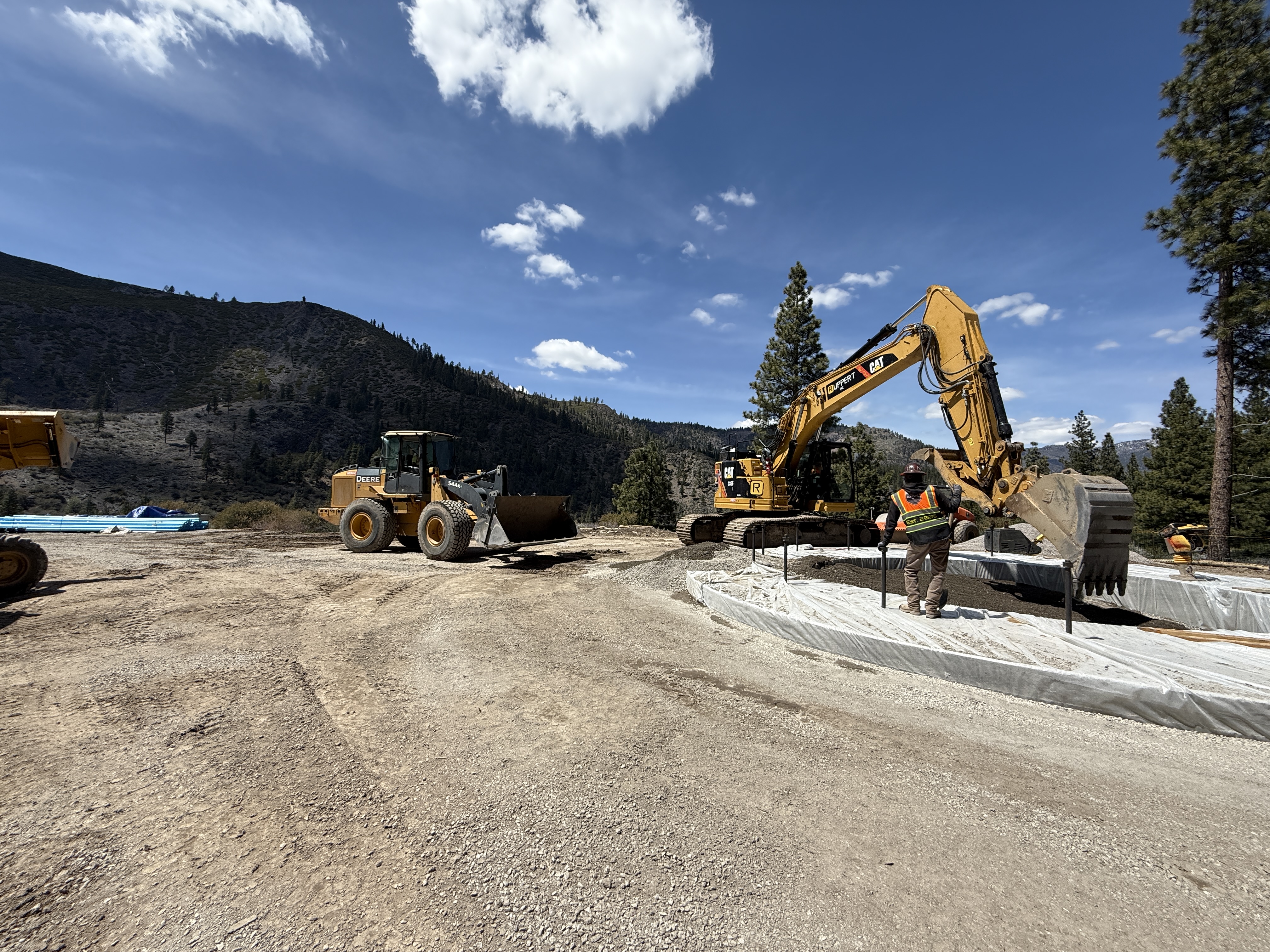 The image shows an active excavation site at the tank foundation area. A large excavator is operating on the right side, with its bucket near the ground. Nearby, a worker in a hi-vis vest is overseeing the process. On the left, a loader is positioned, likely used for moving materials. The work area is surrounded by dirt and gravel terrain against a backdrop of hills and trees.