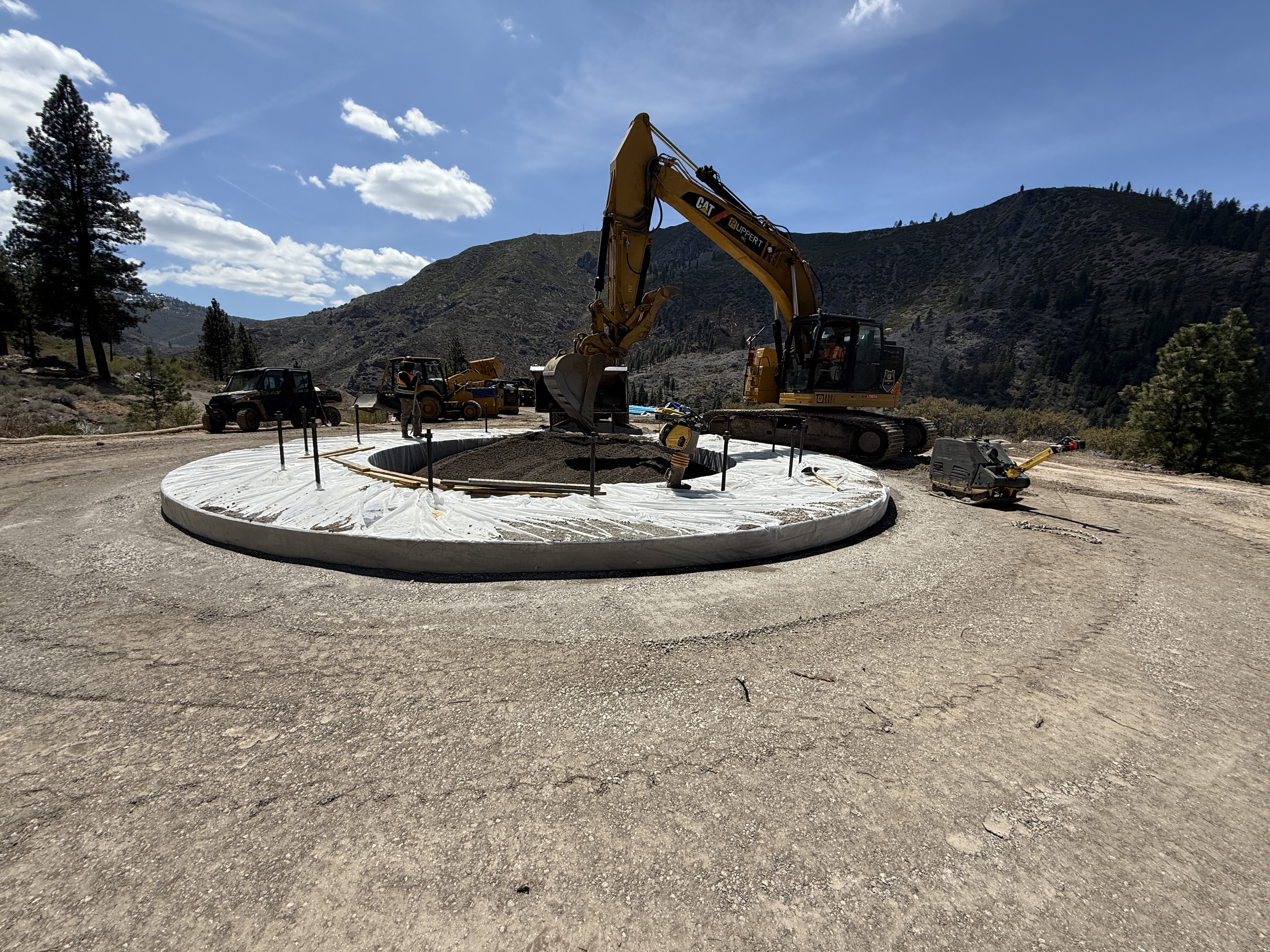 The image shows an excavator and a loader working around a circular concrete foundation base, possibly preparing or compacting the surface. The concrete area is covered with a white material, and several metal rods protrude vertically. The background features a mountainous landscape under clear skies, indicating outdoor site work.