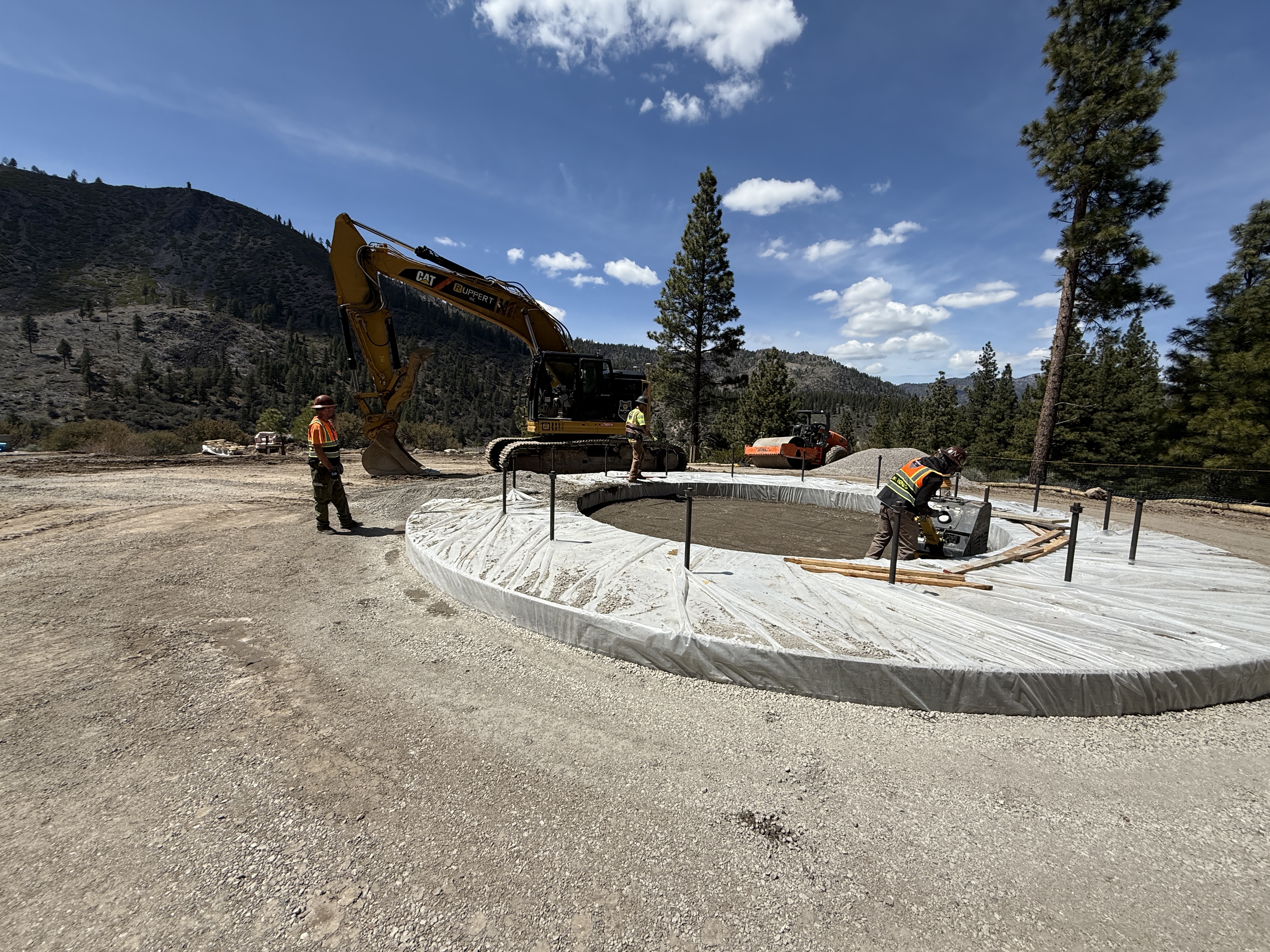 The image shows construction workers at a jobsite with one operating a compactor on a circular tank foundation base. A yellow excavator is adjacent to the foundation with its arm lifted, and another worker stands nearby. The area is surrounded by trees, and the weather appears clear and sunny.