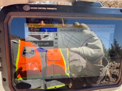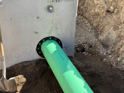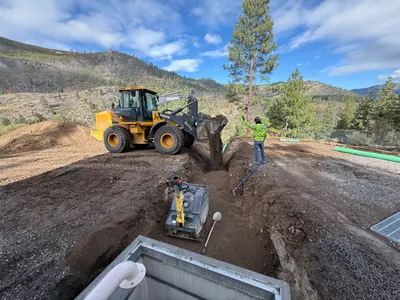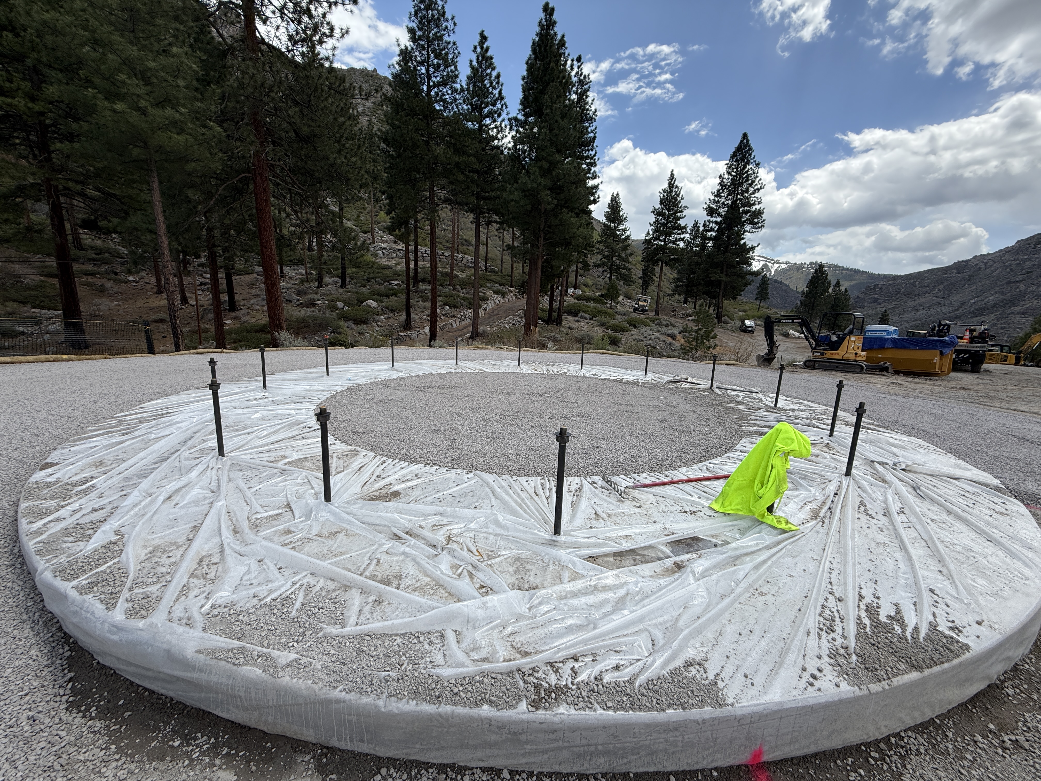 The image shows a circular concrete foundation covered with plastic sheeting, with several vertical pipes protruding from it. A piece of bright safety clothing is draped over one of the pipes. The background includes trees and various construction machinery such as an excavator and a truck. The setting appears rural with mountains in the distance.