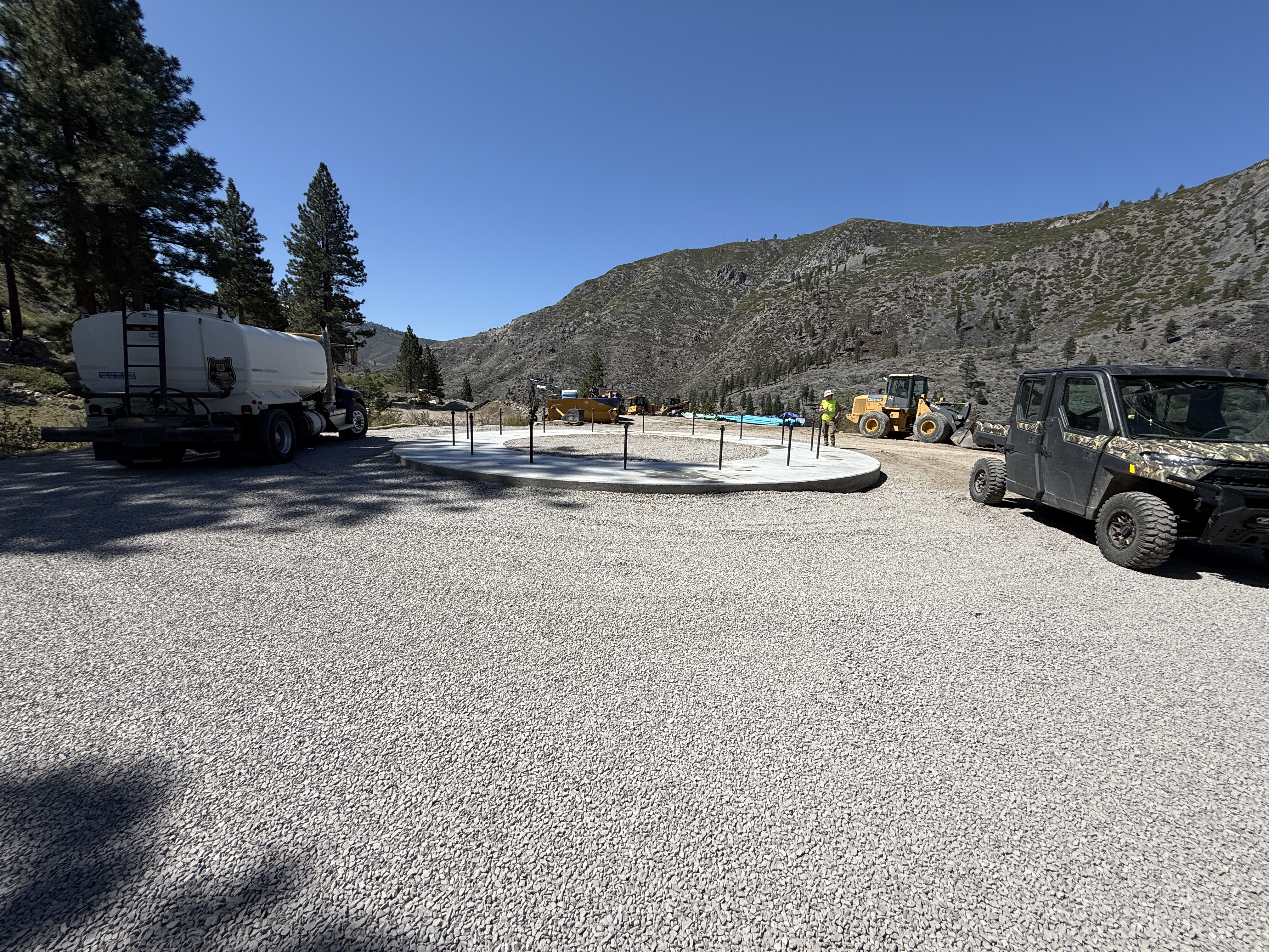 The image shows a tank foundation construction area with a circular concrete pad being worked on. A water truck is parked on the left, and a compact loader is visible near the center. Workers are present, possibly preparing the foundation or parking pad. The area is surrounded by gravel with trees and mountains in the background.