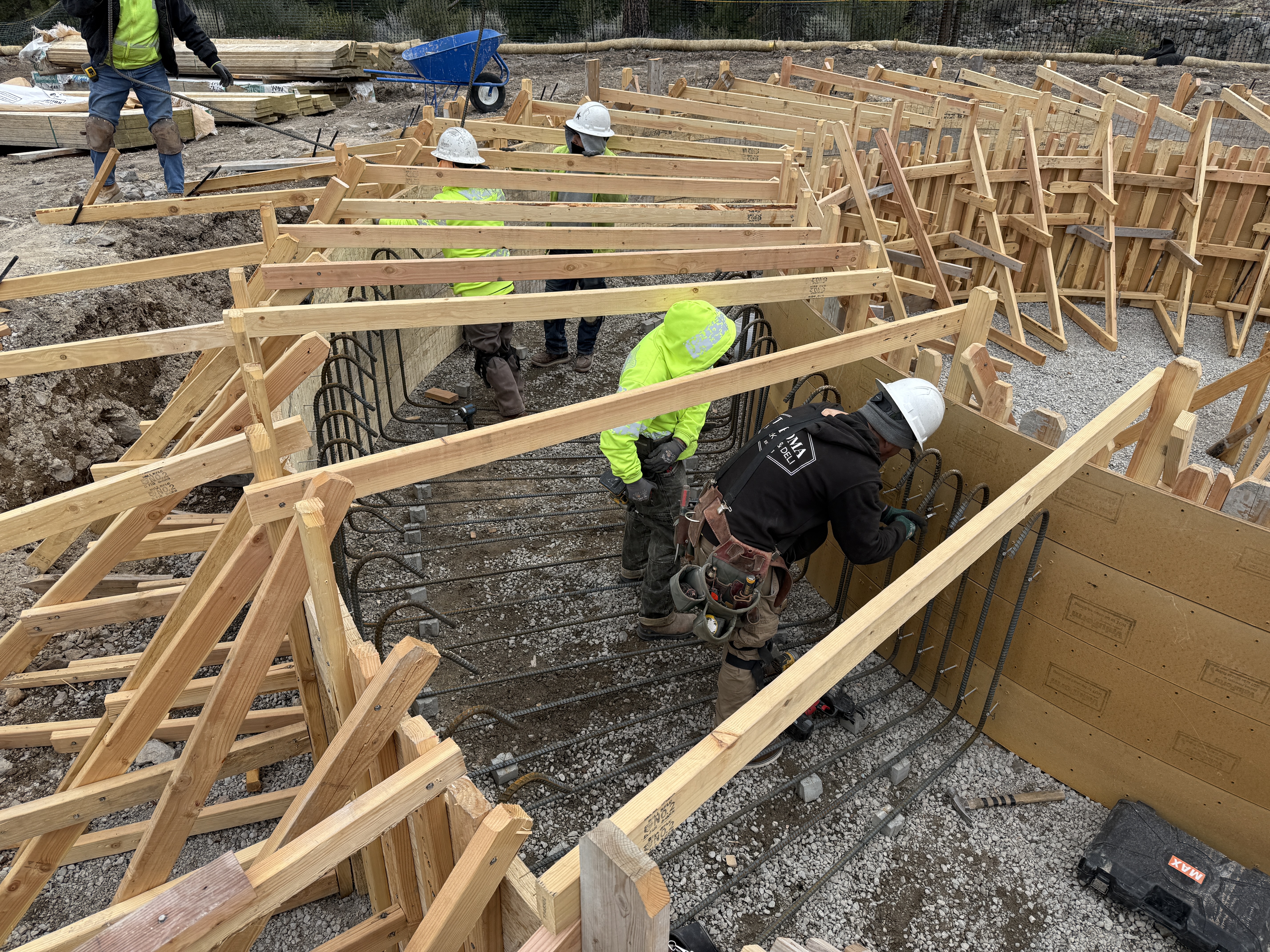 The image shows several workers wearing PPE fitting rebar into a wooden formwork structure at a construction site. The rebar is laid out horizontally and vertically within the formwork. Wooden bracing supports the structure from the outside. The ground is covered in gravel, and a blue wheelbarrow is seen in the background.