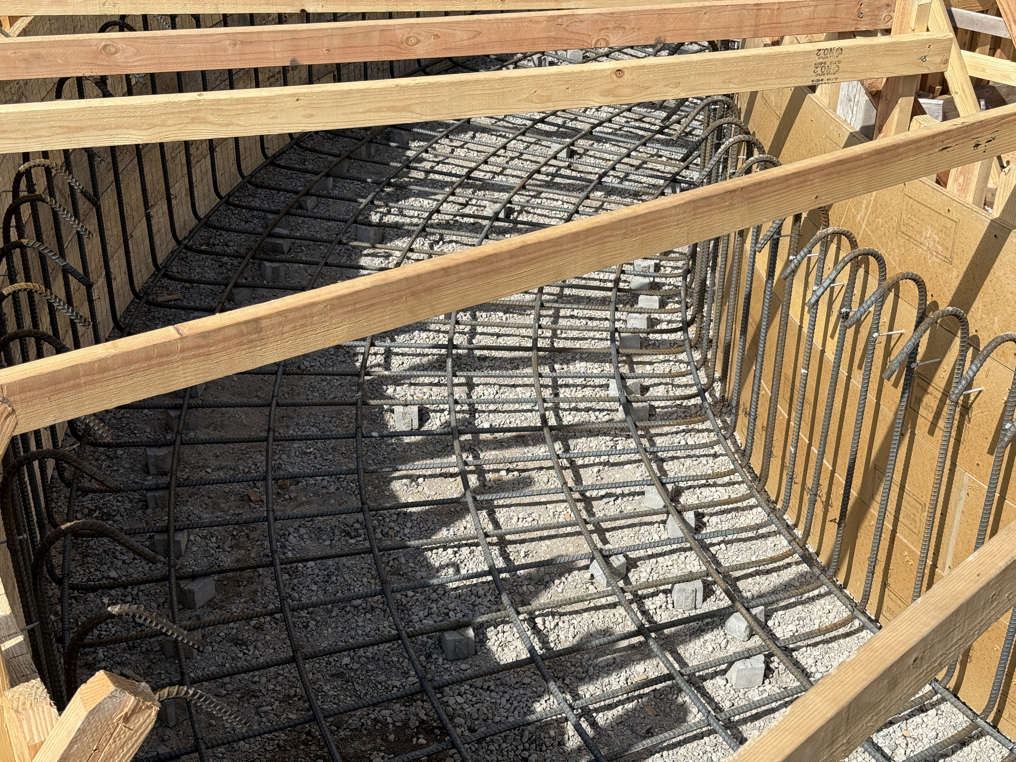 The image depicts a curved rebar grid laid on gravel, indicating preparation for a concrete pour. Wooden form boards are set up to define the shape of the structure, with rebar sticking up around the edges. This appears to be the foundation for a tank due to the curved shape of the form. The gravel provides a stable base for the rebar and helps with drainage.