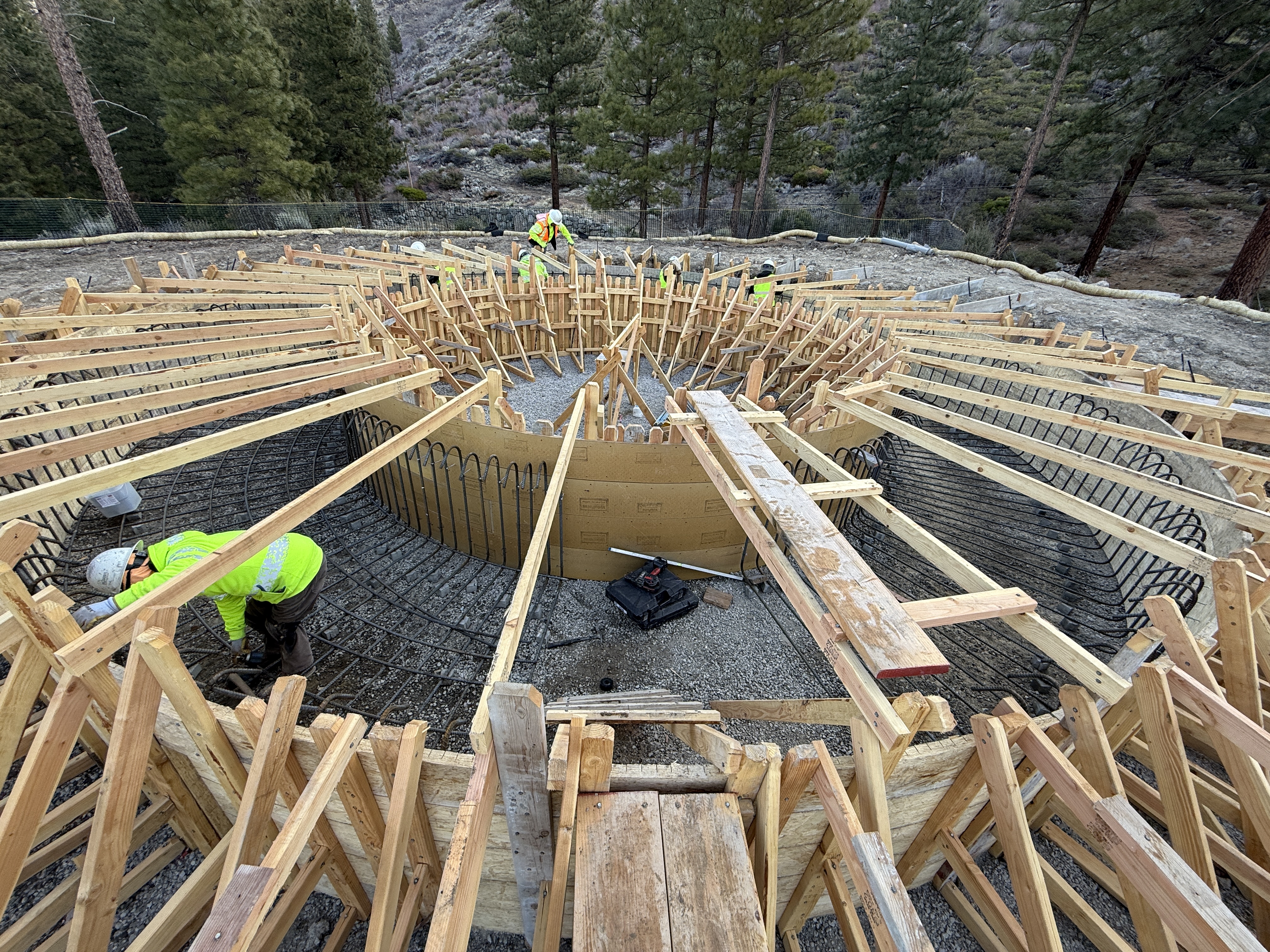 The image shows a circular tank foundation with workers installing rebar and wooden formwork. The formwork creates a ring shape around the foundation. Multiple workers in high visibility clothing and hard hats are present, actively engaging in the rebar placement and formwork setup. The area is surrounded by trees, indicating a natural setting.