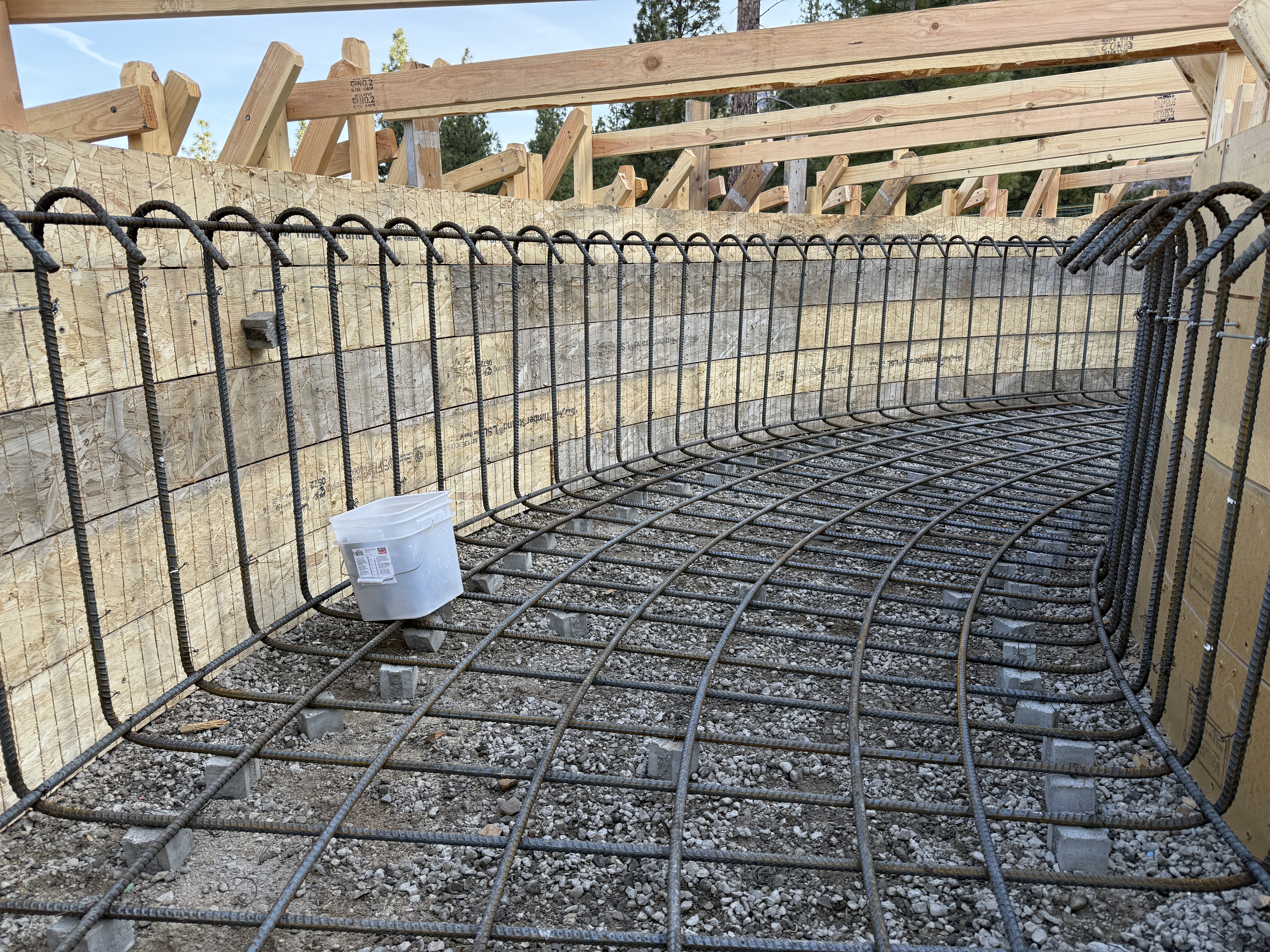 The image depicts a curved section of rebar formwork set up on a gravel foundation, forming the basis of a tank structure. Vertical and horizontal rebar grid is installed with spacers keeping them off the gravel surface. Wooden formwork is positioned on the perimeter, suggesting an upcoming concrete pour. A bucket is placed on the rebar, potentially for scale or work purposes.