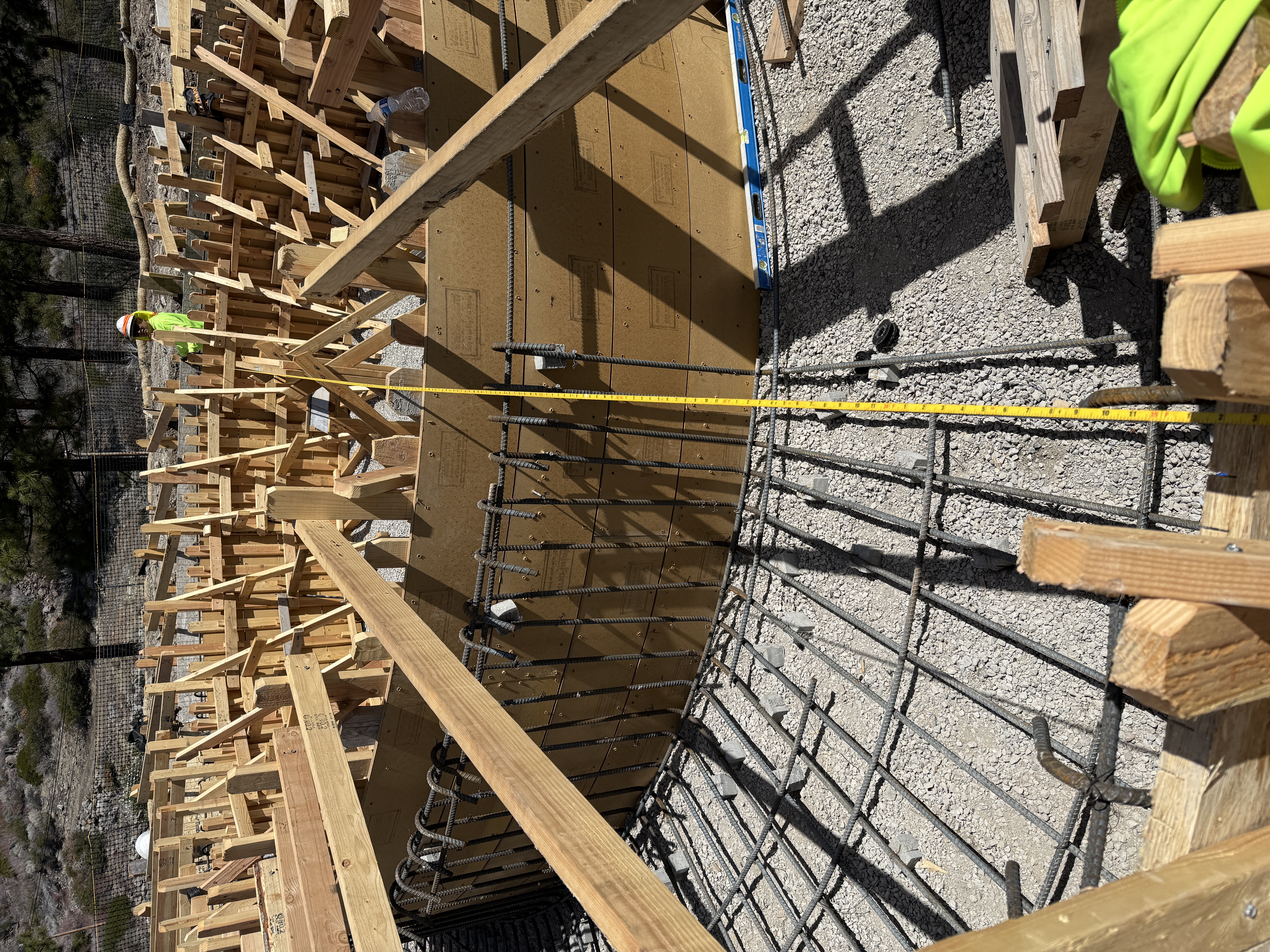 The image depicts a circular structure with rebar laid out over a gravel base and surrounded by wooden formwork. Several horizontal wooden beams are bracing the outer formwork wall. A person in a hard hat and high-visibility clothing is visible at the top area, likely managing or inspecting the work. The environment appears to be well-lit and clear, suggesting active construction work.