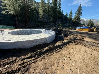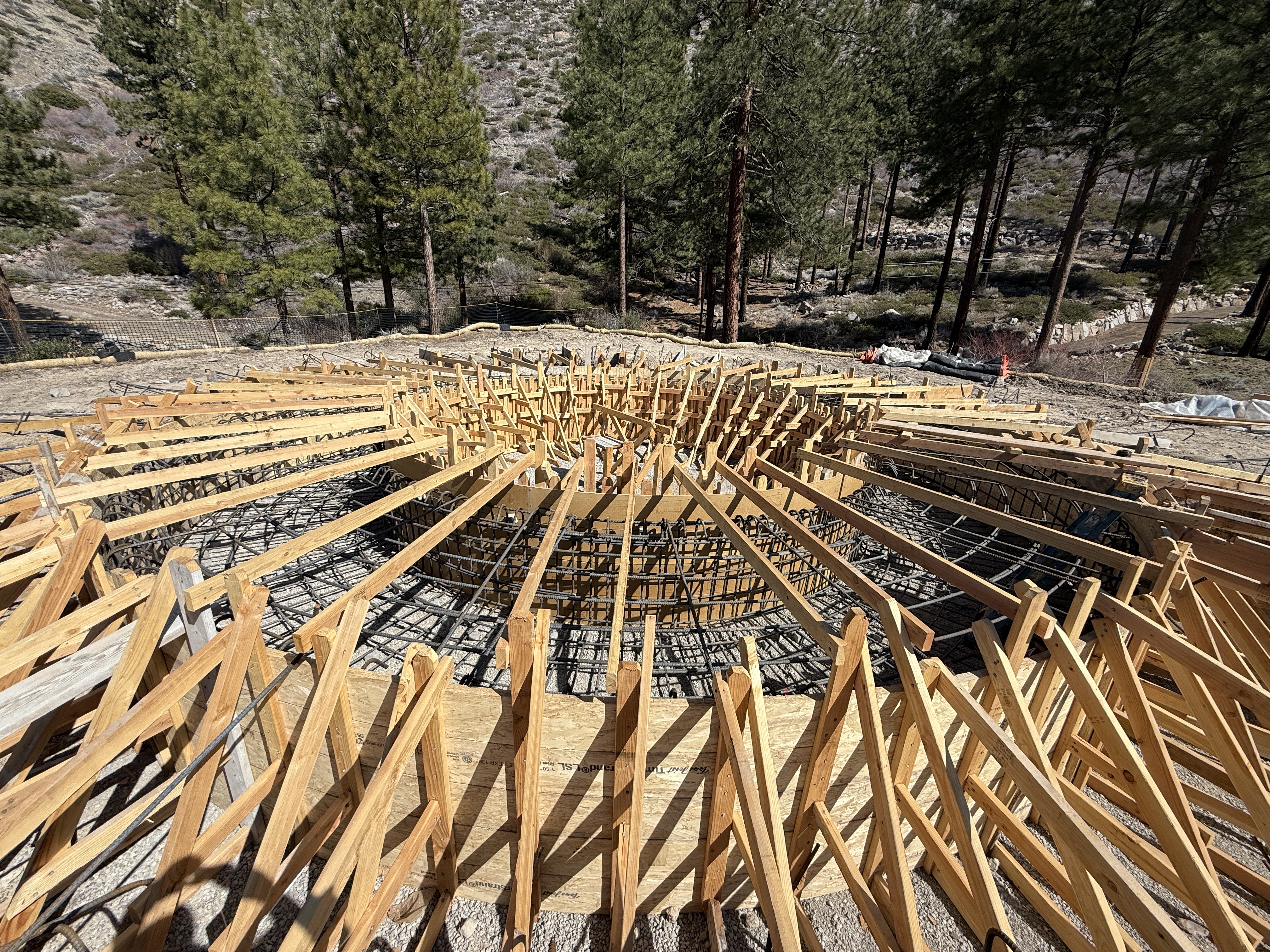 The image shows a circular formwork structure with a grid of rebar set up for a concrete pour, likely for a tank foundation. Wooden supports and braces are arranged in a radial pattern around the rebar. Trees and natural terrain are seen in the background, indicating an outdoor location. Dirt and mixed rocky surface surround the work area.